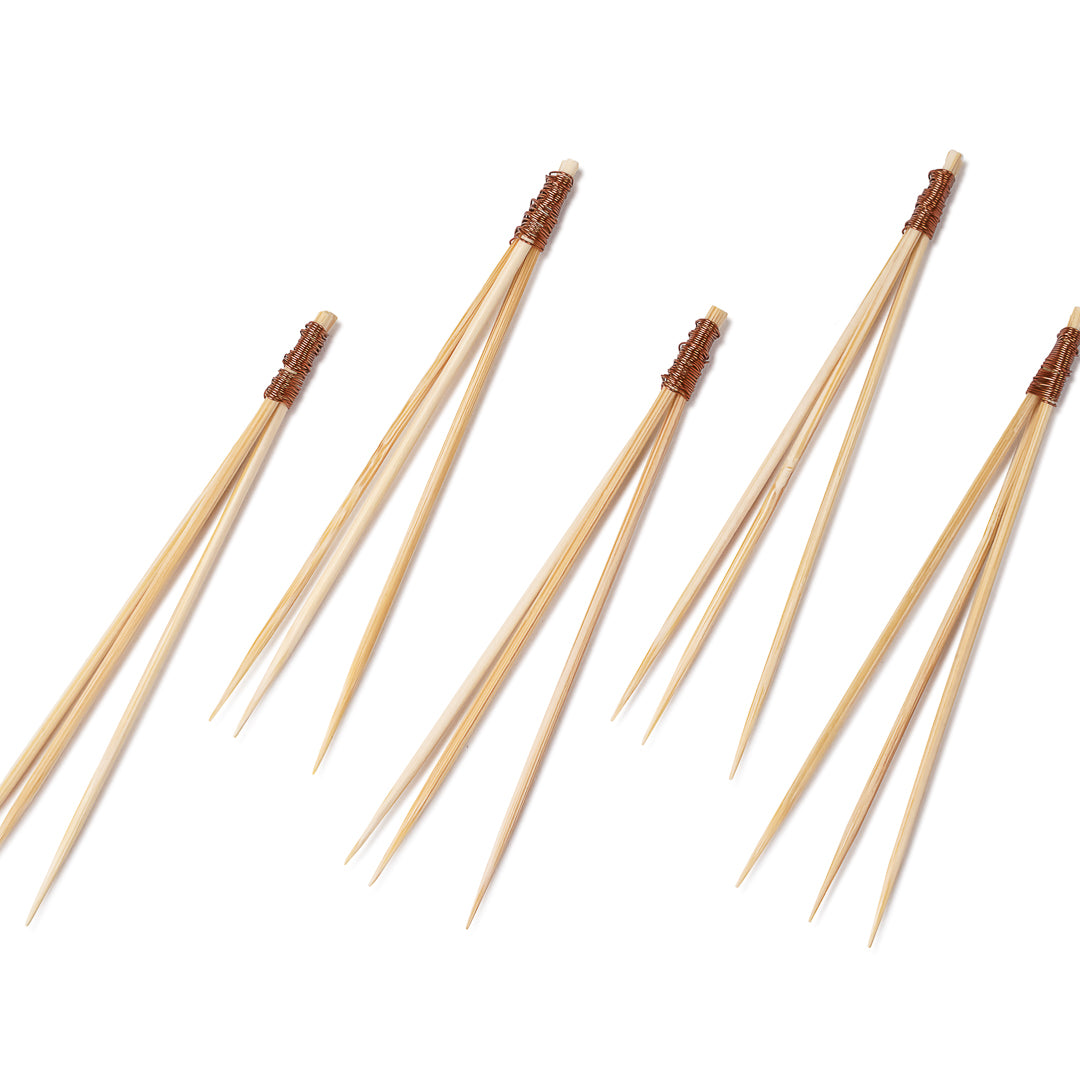 Elevate your food and drink presentations using our Pixy Natural Bamboo Copper Top Picks. Designed with a stylish copper top, these food skewers bring a shiny touch to cocktail garnishes, cheeses, or fruit spreads. These beef skewers have a sharp pointed end that easily pierces through all kinds of hot or cold foods. Made with premium sustainably sourced bamboo, these antipasto skewers are disposable so guests can easily clean up leftover skewers in an easy manner. Ideal for mess-free service, these food skewers have a smooth finish and are break-resistant to prevent them from splintering or snapping. These beef skewers measure 3.5 inches in length. Shipped in a 100 count box.
