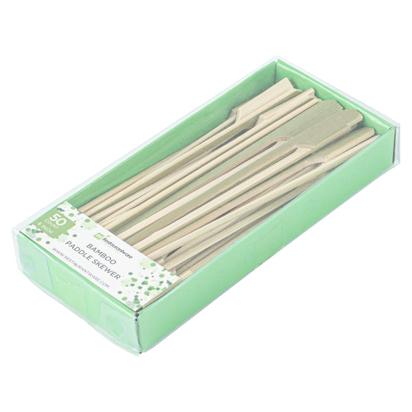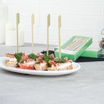 These bamboo skewers feature a knotted or paddle design, allowing guests to easily grab bite-sized treats from platters or displays. Provides a secure grip when enjoying appetizers or desserts!