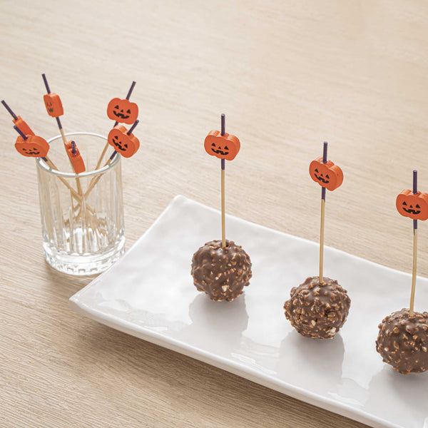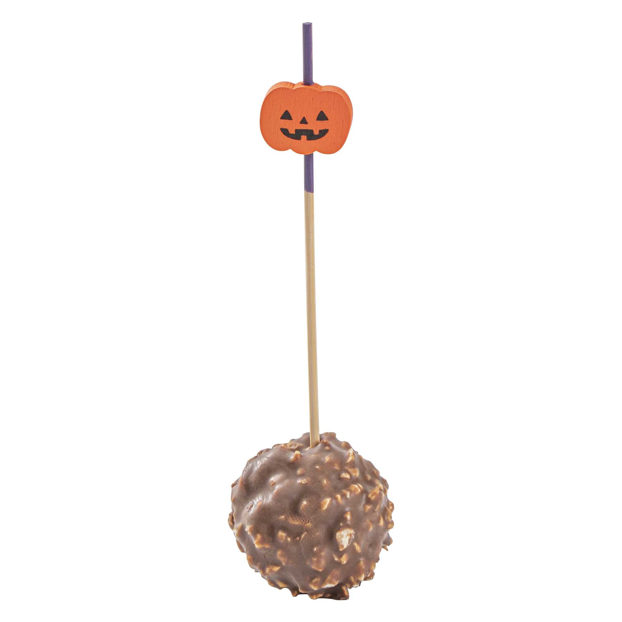 Brighten your appetizers with our Pixy eye-catching Orange Bamboo Jack-o-Lantern Skewers. Featuring a wooden pumpkin design with a two-tone finish, these bamboo decorative picks add a festive touch to cocktail parties and buffet tables. Constructed from sustainably-sourced bamboo, these disposable appetizer skewers possess a durable and stable nature that maintains its form when loaded with food. The smooth, splinter-free texture ensures a comfortable eating experience without any wood chip interference. These bamboo skewers are biodegradable and commercially compostable, offering an eco-conscious disposal solution. The sharp tips allow of these cocktail skewers for easy piercing of various food items without affecting their structure. Each party food toothpick measures 4 inches in length by 0.75 inches in width. Shipped in a 1,000 count box.