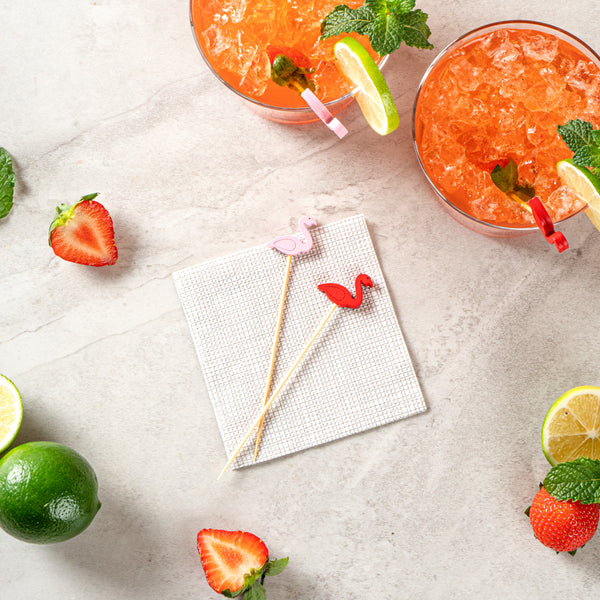 Enhance your presentation with tropical-themed garnishes. Tropical Flair Pixy Bamboo Cocktail Sticks feature a delightful flamingo design that adds a vibrant touch to appetizers and beverages, making them ideal bamboo cocktail sticks for any festive occasion. Measuring 4.7 inches in length, these flamingo cocktail picks boast a sharp end that effortlessly pierces through a variety of ingredients, ensuring efficient and precise garnishing. Constructed from biodegradable bamboo, the decorative cocktail skewers are splinter-free, providing safe handling while being environmentally conscious. Their resilient bamboo material is both hot and cold food friendly, allowing for versatile use in a range of culinary applications. Elevate your foodservice experience with these unique picks, perfect for catering events and themed parties. Sold in a 1000 count box.