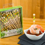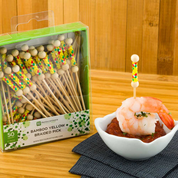 Energize the presentation of your miniature appetizers and bite-sized desserts with our Pixy trendsetting Yellow Braided Picks. Designed with colorful braided detailing, these nature-friendly bamboo picks are sure to impress your guests. Use these decorative picks as cocktail sticks to spear lime wedges for a mojito -- or use them as martini picks to skewer blue cheese-stuffed olives for a gin martini. Equipped with an easy-to-hold handle, these cocktail sticks are also ideal for serving one-bite appetizers like crispy coconut shrimp and teriyaki chicken bites. Not to mention, their bright yellow braids and natural bamboo beads make miniature desserts like chocolate-covered berries and creamy chocolate truffles absolutely irresistible! These power-packed 4-inch bamboo picks are available in a 50 count box.