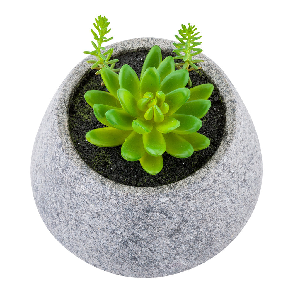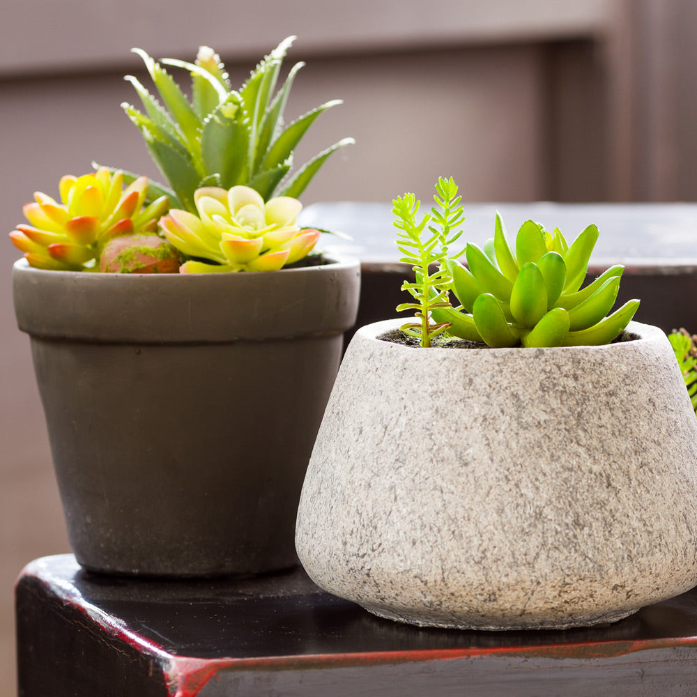 FAUX SUCCULENT ARRANGEMENT - GRAVEL CONCRETE PLANTER, ROUND