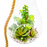 FAUX SUCCULENT ARRANGEMENT - HANGING GLASS TERRARIUM, HEMP ROPE