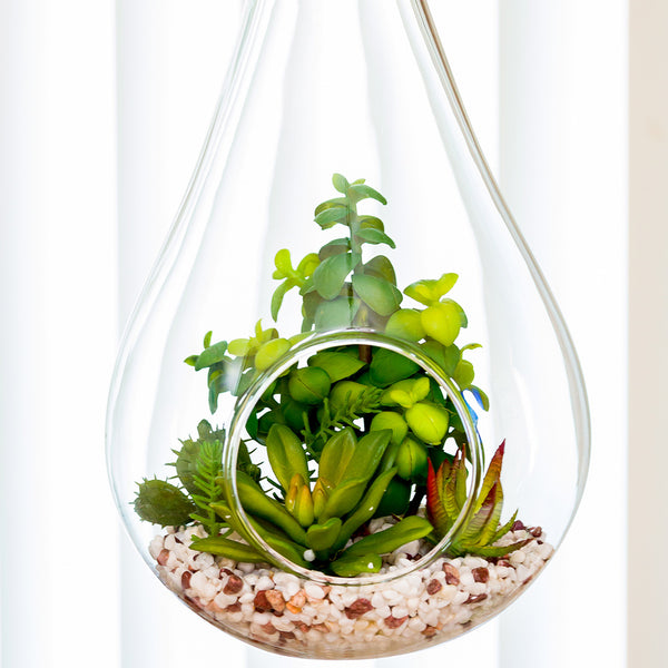 Give your decor a lively upgrade with this Table Art Faux Succulent Arrangement in a Hanging Glass Terrarium! Housed in a teardrop-shaped terrarium with a knotted hemp rope, this realistic fake succulent arrangement adds a refreshing pop of foliage to any setting. The flat base of the terrarium balances nicely on shelves and tabletops, and the included hemp rope can be used to hang the terrarium and suspend your faux hanging succulents in mid-air. Crafted from thick and flexible plastic, these artificial succulents feature realistic leaves that don't require any watering or maintenance! These fake hanging succulents are secured with a selection of white and brown gardening rocks to ensure they look great from every angle. This Table Art arrangement measures 12.5 inches tall by 7.75 inches wide. Sold in a 1 count box.