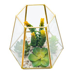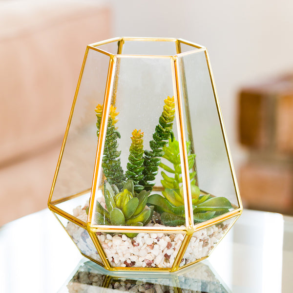 FAUX SUCCULENT ARRANGEMENT - HEXAGONAL GLASS TERRARIUM, BRONZE