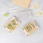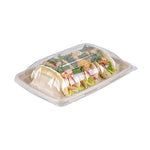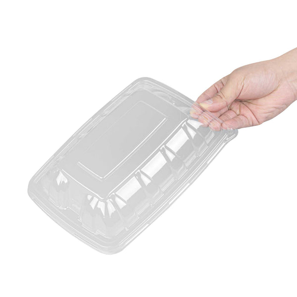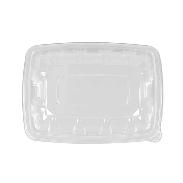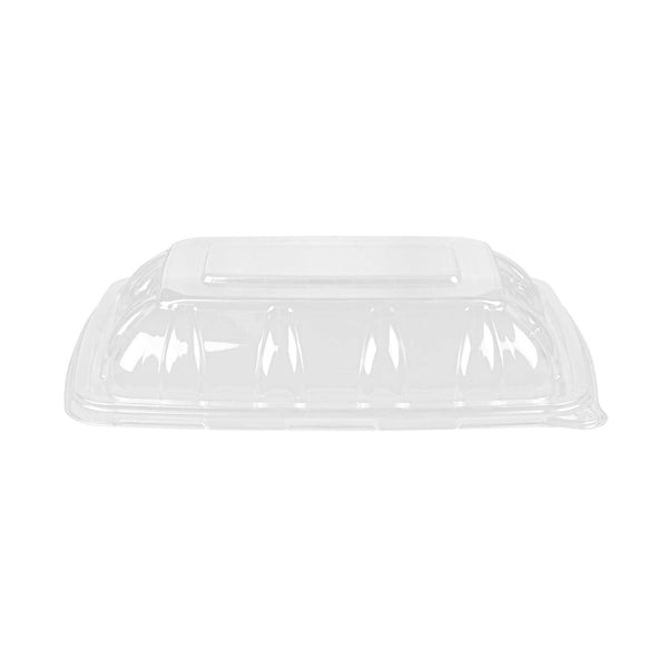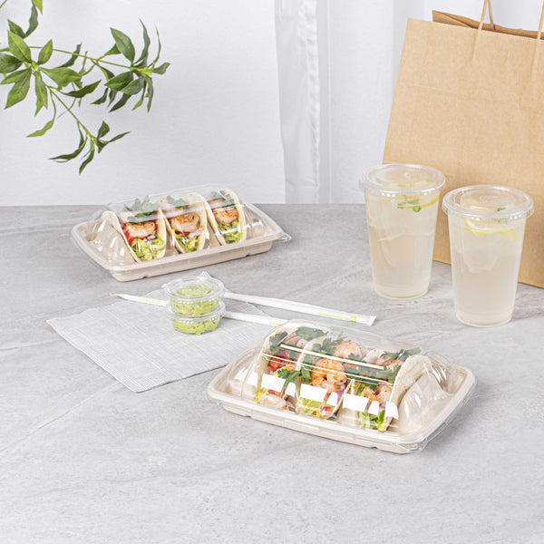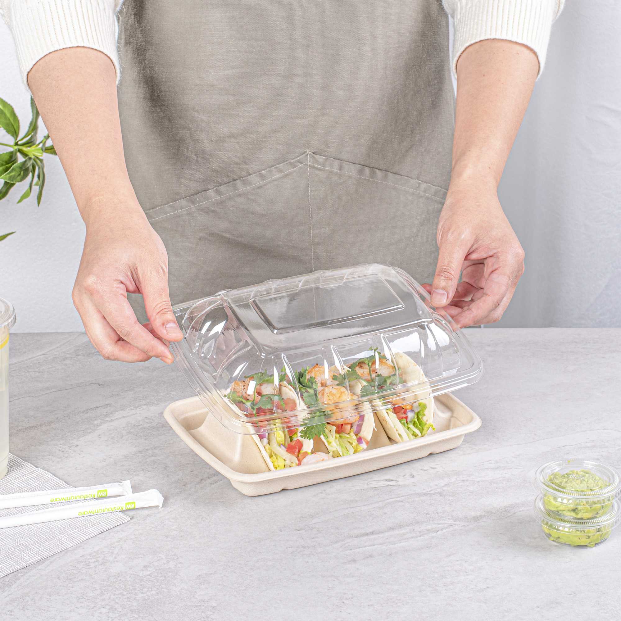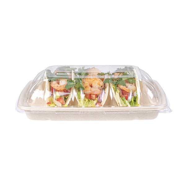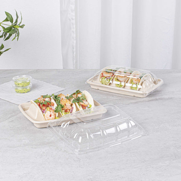 Keep your tacos fresh and visually appealing with our see-through taco tray solution. The Pulp Safe Clear Dome Lid provides a perfect fit for taco trays, ensuring taco visibility and maintaining freshness with its clear dome lid. Crafted from recyclable plastic, this lid offers foodservice professionals a sustainable choice that complements any eco-friendly initiative. Measuring 9.2 inches by 6.7 inches by 1.7 inches, this plastic taco lid is designed to be greaseproof, maintaining cleanliness and reducing mess during service. Additionally, its freezer-safe feature allows you to prep ingredients in advance, enhancing operational efficiency. Whether you're storing ingredients in the refrigerator or showcasing them under a heat lamp, this lid is tailored for both hot and cold food applications. Choose this taco tray cover to enhance your food presentation and service efficiency. Each order includes 50 Pulp Safe Clear Dome Lids.