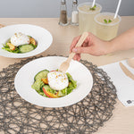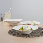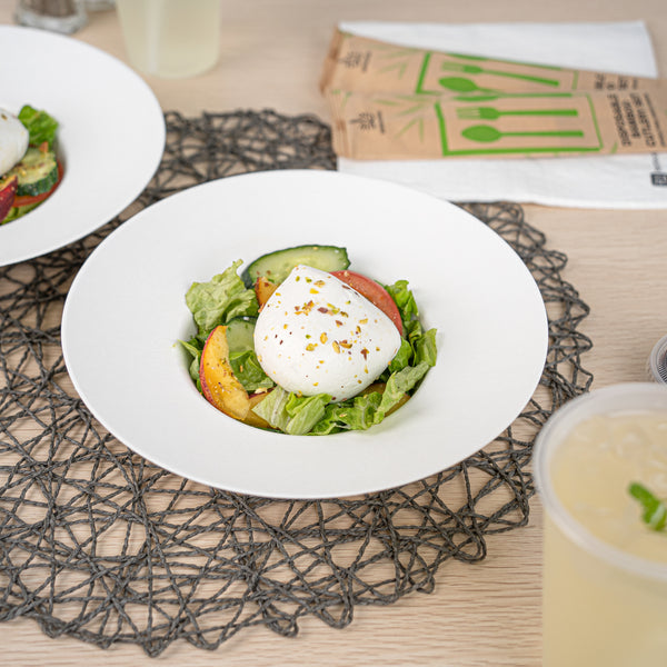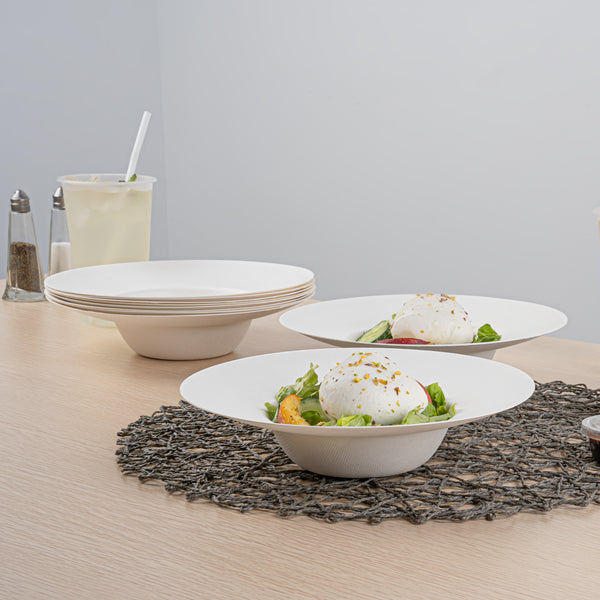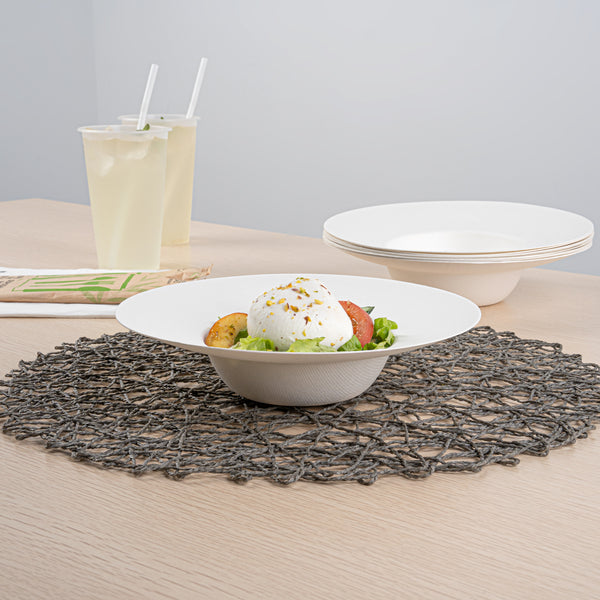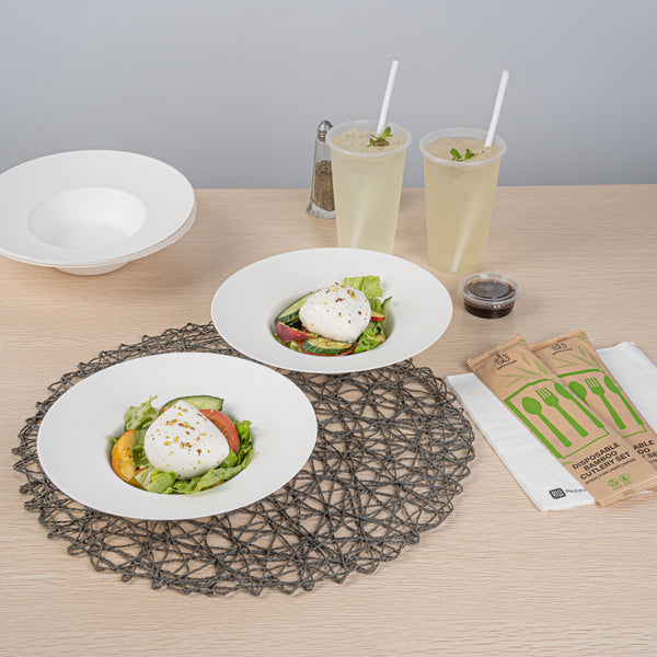 Accentuate your dining events with our Pulp Safe No PFAS Added 10-Ounce Round White Sugarcane / Bagasse Salad Bowls / Dessert Plates. Manufactured without added PFAS, these home compostable round bowls ensure a secure and delightful eating experience. These salad bowls are BPI Certified for commercial composting, making them a sustainable choice for your business. The unique wide-rim design of these dessert plates enhances the aesthetic charm of your meals while leaving a notable impression on your guests. Constructed from robust bagasse material, these home compostable white dishes mark their elegance and serve as a reliable medium for displaying a variety of tempting foods. Plus, these microwavable white bagasse bowls offer the convenience of quick and easy food reheating when required. Measuring 8.75 inches in diameter by 2 inches in height and containing up to 10 ounces, these multipurpose salad bowl plates provide ample space for serving a diverse range of tasty treats. Sold in a 25 count box. This item will only degrade outside of the traditional solid waste stream.