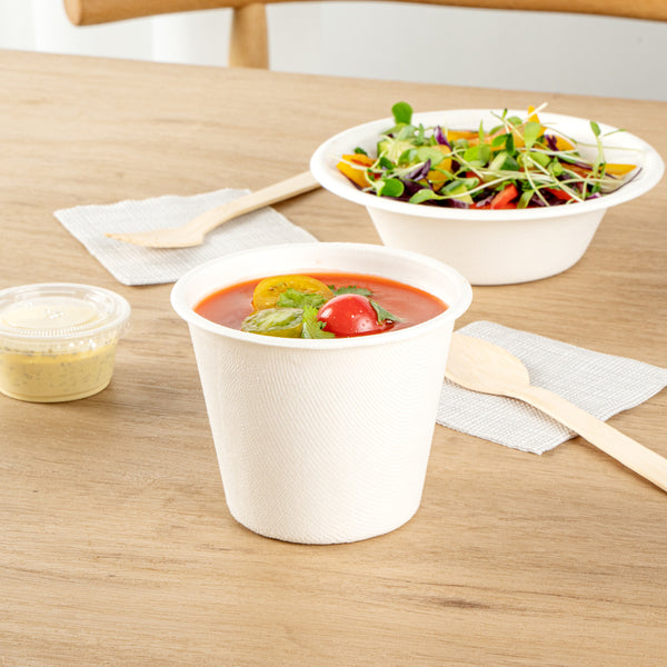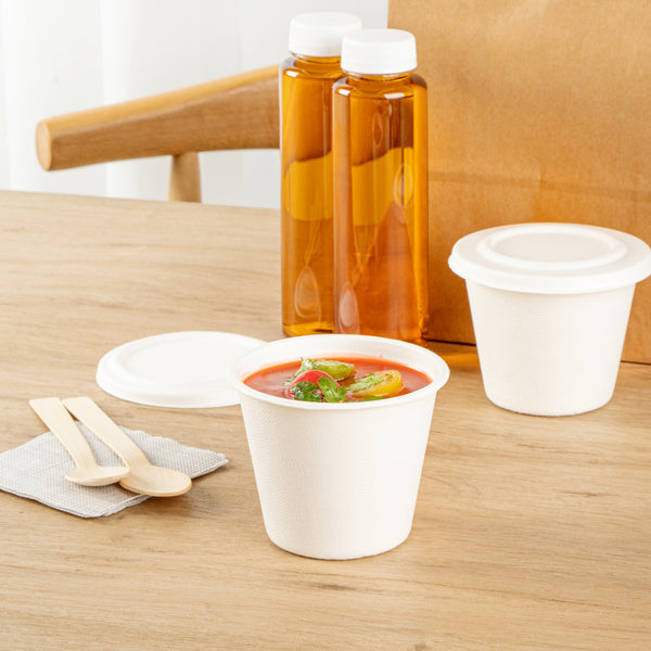 Enhance your eco-friendly foodservice with reliable compostable options. The Pulp Safe Compostable Soup Cup is crafted from sugarcane bagasse, providing an eco-friendly alternative to traditional plastic containers and supporting your sustainability initiatives. This compostable soup cup is designed with no PFAS added, ensuring food safety and aligning with health-conscious practices. Measuring 4.1 inches in diameter, this home compostable cup allows for easy disposal in home composting systems, reducing waste and promoting environmental responsibility. With a 15-ounce capacity, this round soup container is ideal for serving generous portions of soups, stews, and other hot or cold dishes, enhancing customer satisfaction. Its microwavable and freezable features offer flexibility in food storage, providing convenience for reheating or storing leftovers. Choose a microwave-safe cup that meets the needs of your eco-conscious clientele. Each order includes 100 Pulp Safe Compostable Soup Cups.