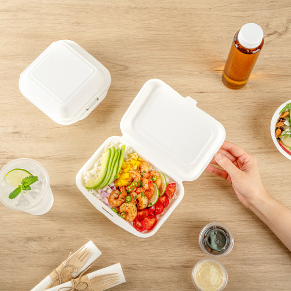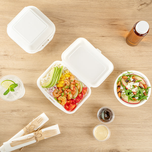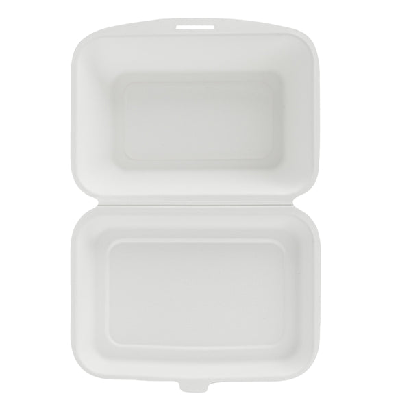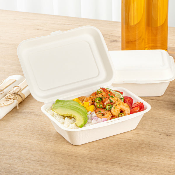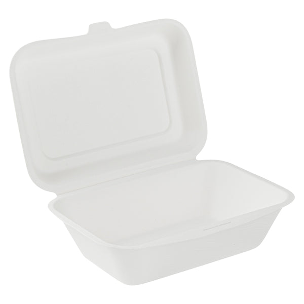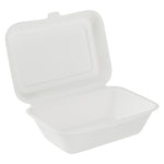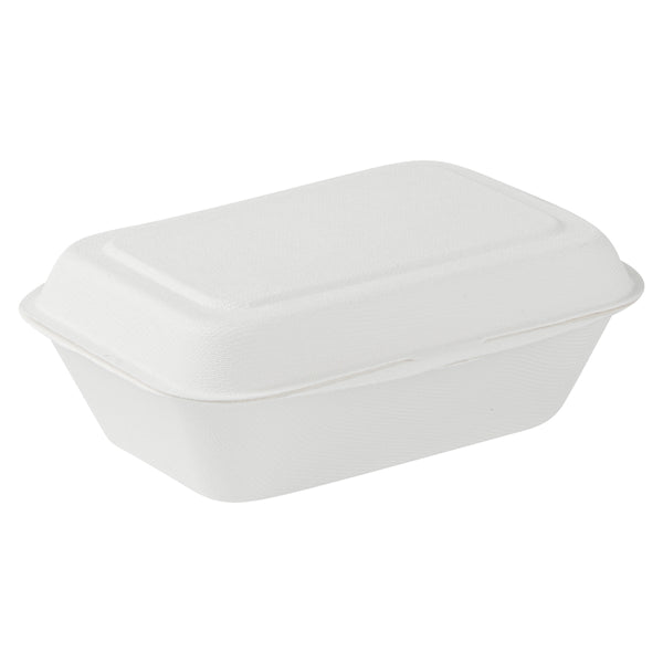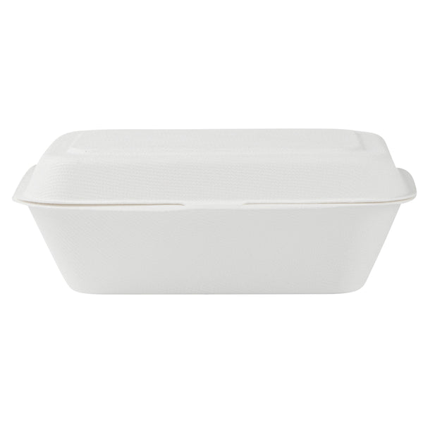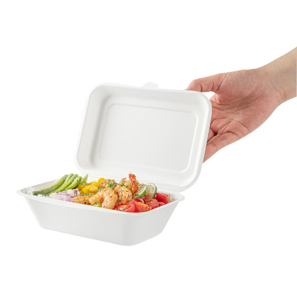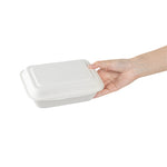 Securely transport food orders with our Pulp Safe No PFAS Added 20-ounce Rectangle White Sugarcane / Bagasse Clamshell Containers. Prioritizing customer safety during mobile dining, these bagasse containers are made without the inclusion of PFAS additives. With their home compostable nature, these trays minimize the environmental impact of disposal. To ensure customer confidence when dining on the move, these bagasse containers are manufactured without any added PFAS. These catering boxes are made of high-quality bagasse, making them durable and sturdy. Fully compostable in home composting systems, these disposable food containers offer superior eco-friendliness by seamlessly integrating into your everyday waste reduction efforts. These hot and cold friendly bagasse containers are perfect for serving all foods. Microwavable and freezable, these take out boxes allow easy refrigerating and reheating of foods. With hinged lids and a lab lock mechanism, these bagasse boxes are ideal for fast-paced carry out services. Measuring 7.25 inches long by 5.5 inches wide by 2.5 inches tall, these rectangular take out boxes have a capacity of 20 ounces. Shipped in a 100 count box. This item will only degrade outside of the traditional solid waste stream.