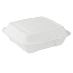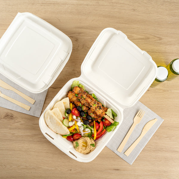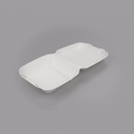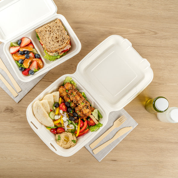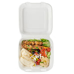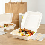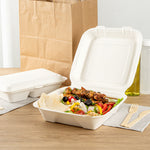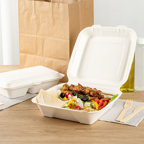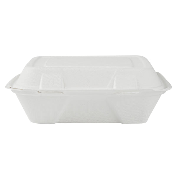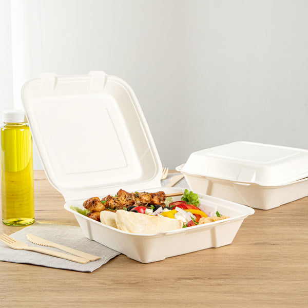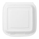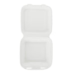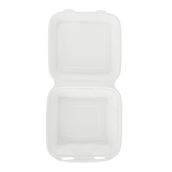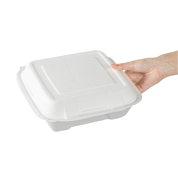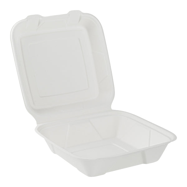 Take meal on the go with our Pulp Safe No PFAS Added 32-ounce White Sugarcane / Bagasse Large Clamshell Containers. In adherence to strict state regulations, these bagasse containers are formulated without the incorporation of PFAS. Made with bagasse, these take out containers are home compostable and biodegradable. With a hot and cold friendly design, these catering boxes can be used for serving and packing all kinds of foods. Built-in with a hinged lid and a secure tab lock, these carry out boxes prevent food spillage during food deliveries. These bagasse containers are freezable and microwavable to refrigerate and reheat leftover foods. The sturdy construction of these bagasse containers allows you to carry heavy meals without breaking. Measuring 9.25 inches long by 9.25 inches wide by 3.25 inches tall, these take out boxes have a capacity of 32 ounces. Shipped in a 100 count box. This item will only degrade outside of the traditional solid waste stream.