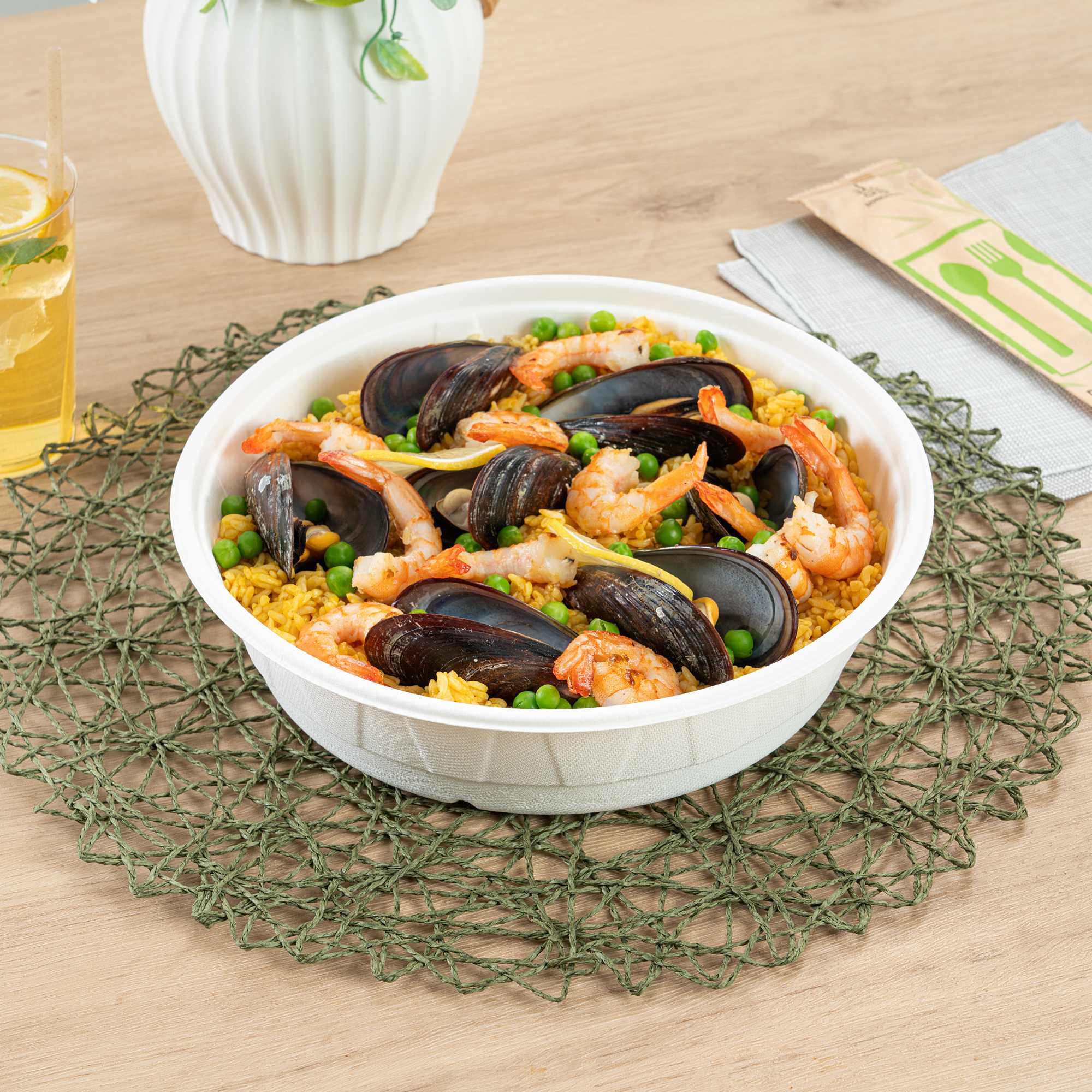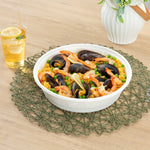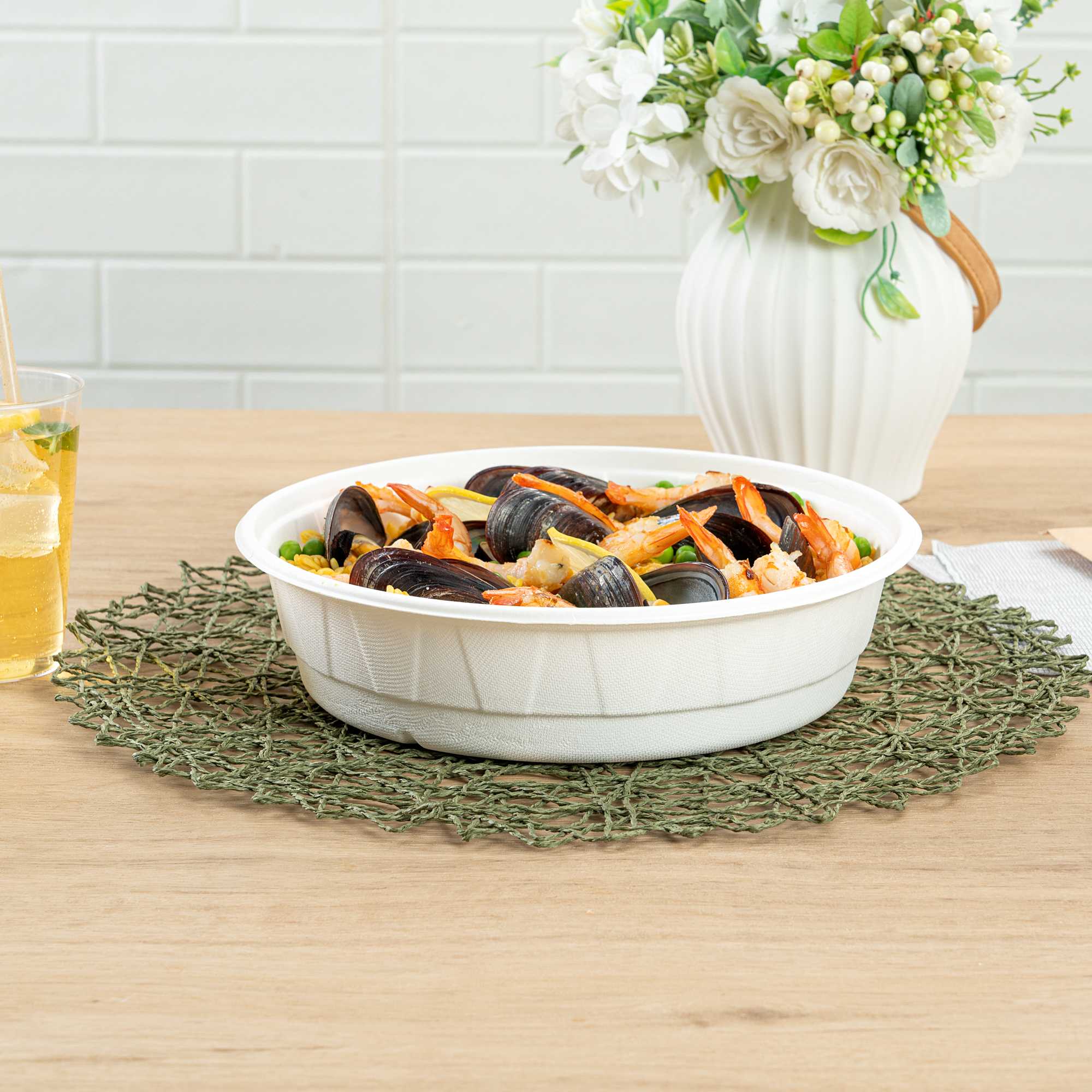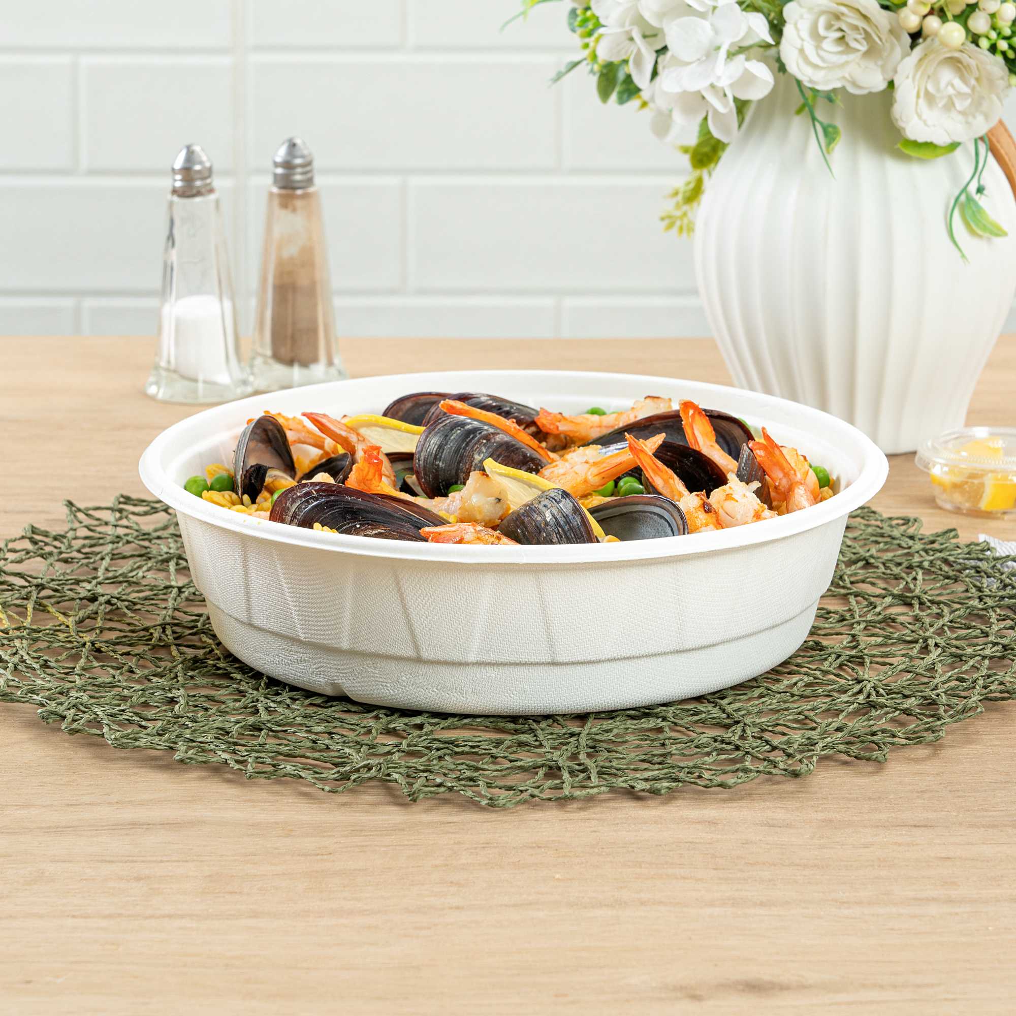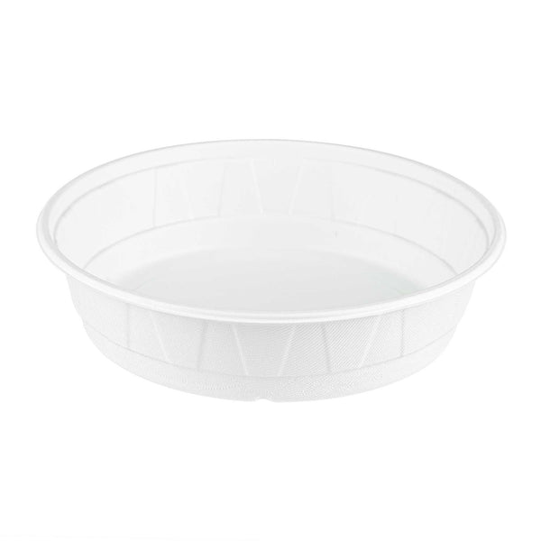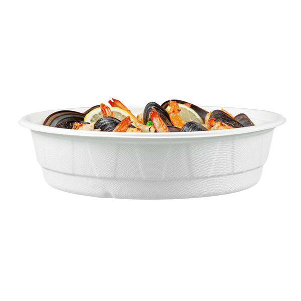 Serve sustainable meals with confidence using our Round White Bagasse Bowl. Crafted from bagasse, these compostable bowls provide a guilt-free serving option for environmentally conscious kitchens. Enjoy versatile dining options with a microwave-safe and freezer-safe design that supports both hot and cold dishes, making it a perfect disposable bowl for any menu. Featuring a large 67.63-ounce capacity, these bowls are ideal for serving hearty salads or noodle dishes, accommodating various culinary creations with ease. Their greaseproof design ensures that there is no leakage during transport and storage, enhancing the reliability of your foodservice operations. With dimensions of 9.92 inches in length and width, and 2.47 inches in height, these biodegradable bowls are easy to stack, saving valuable storage space in busy environments. Elevate your dining service with the convenience and sustainability of a compostable bowl. Sold in a 200 count box.