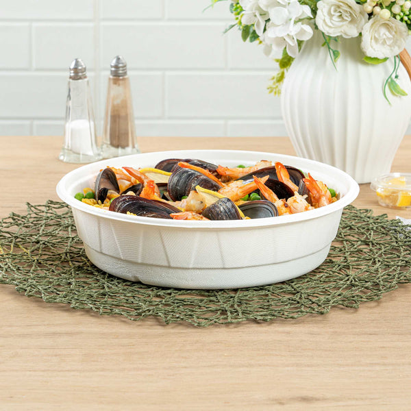 NO PFAS ADDED 68 OZ ROUND WHITE BAGASSE BOWL - HOME COMPOSTABLE