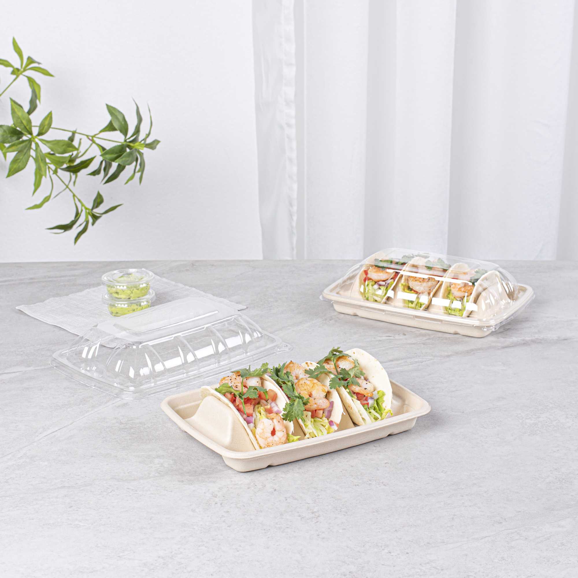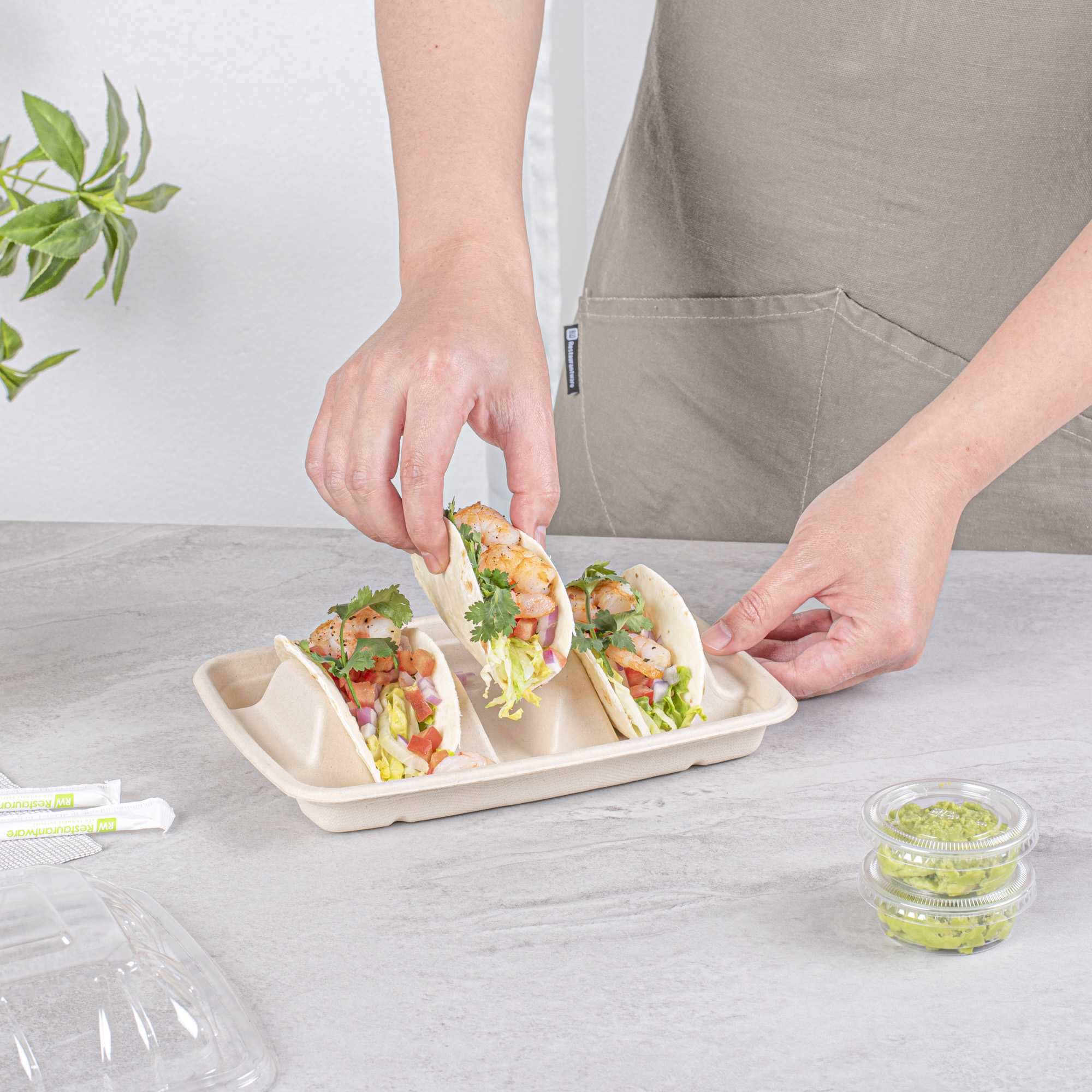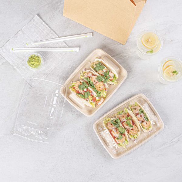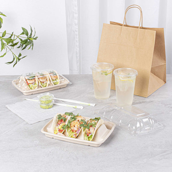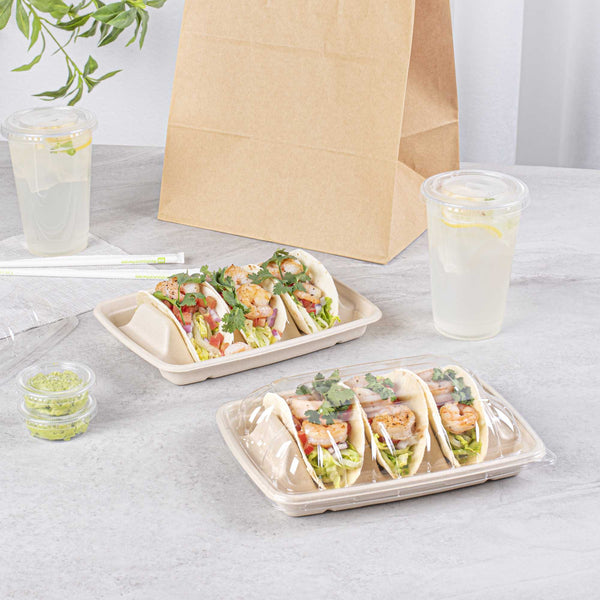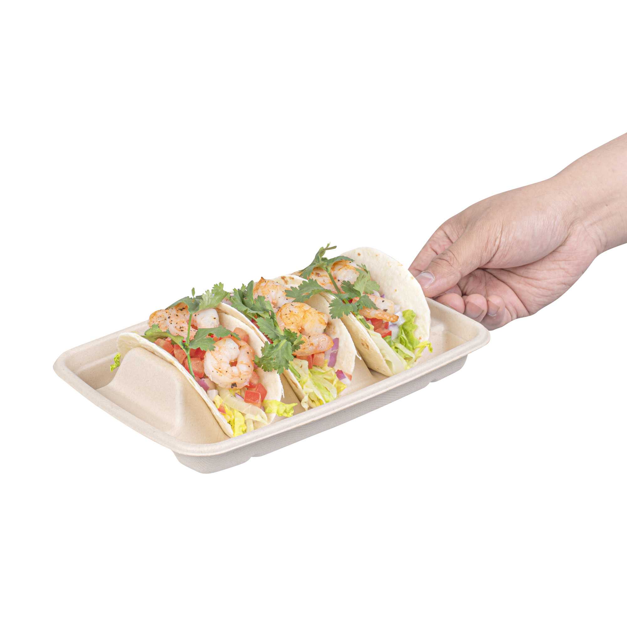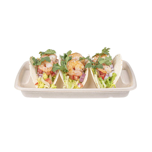 Ensure mess-free taco presentations with our innovative taco serving tray. The Pulp Safe Three-Compartment Bagasse Taco Shell Holder features three dividers that keep tacos upright and organized, enhancing your foodservice efficiency. Made from natural bagasse, these disposable taco holders are compostable, providing an eco-friendly solution for your establishment. The greaseproof design prevents spills and messes, making it an ideal taco shell holder for busy kitchens. With its microwave-safe material, you can reheat food without transferring containers, streamlining your kitchen operations. Measuring 8.9 inches in length, 6.4 inches in width, and 1.6 inches in height, this taco serving tray offers ample space for tacos, sandwiches, and burritos. Free from plastic, PFAS, and BPA, it ensures safe and healthy food presentation. Elevate your sustainable foodservice with this taco serving tray. Each order includes 100 Pulp Safe Three-Compartment Bagasse Taco Shell Holders.