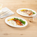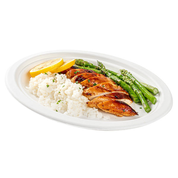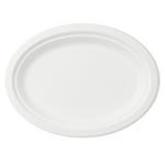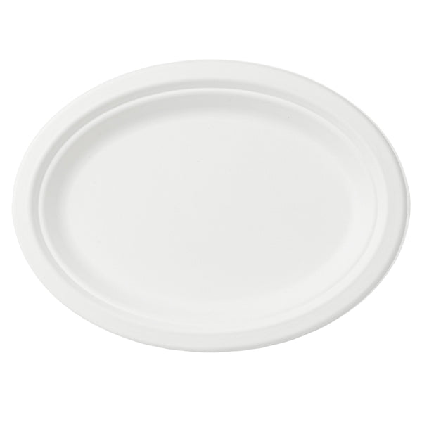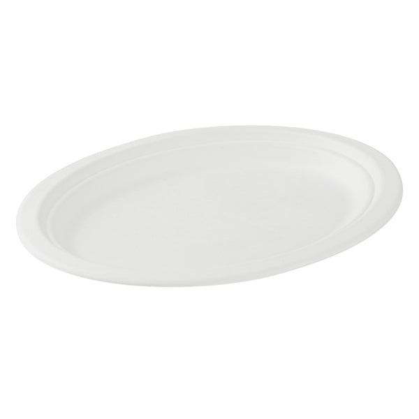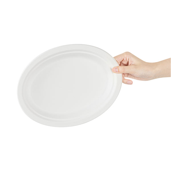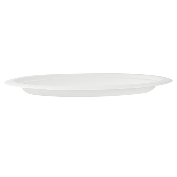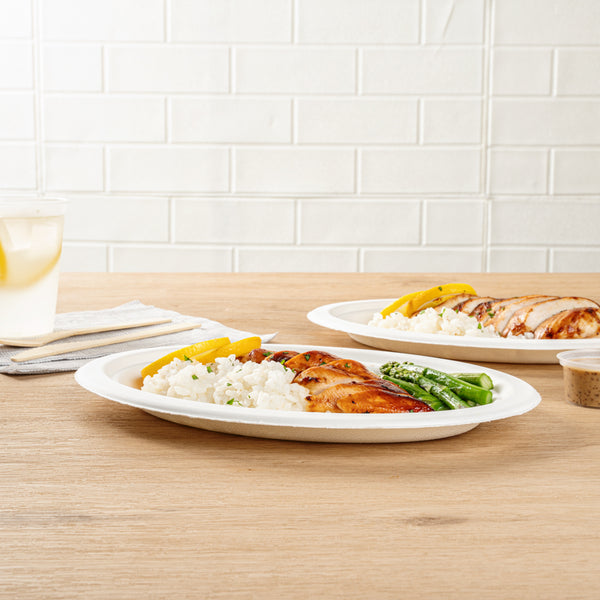 Provide your signature breakfasts with our Pulp Safe No PFAS Added Oval White Sugarcane / Bagasse Medium Plates. To create a safe and worry-free dining experience for customers, these bagasse plates are made without any added PFAS. These oval dinner plates are constructed from high-quality bagasse, making them sturdy enough not to break mid-meal. Discard these disposable plates safely after large events, as they are biodegradable and home compostable. Serve varieties of hot or cold foods using these bagasse plates, as they are hot and cold friendly. To let you conveniently refrigerate and reheat meals, these sugarcane large plates are freezable and microwavable. With extended rims, these eco-friendly plates allow you to hold them easily. Featuring a white shade, these no PFAS added pulp plates complement all kinds of table settings. Measuring 10.5 inches long by 7.75 inches wide, these bagasse plates are perfect for serving meals, entrees, or snacks. Shipped in a 100 count box. This item will only degrade outside of the traditional solid waste stream.