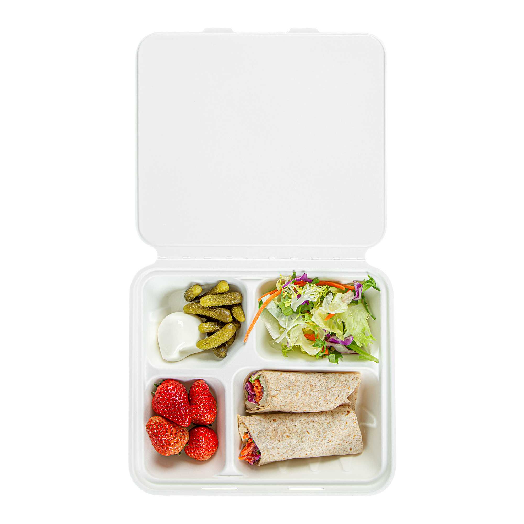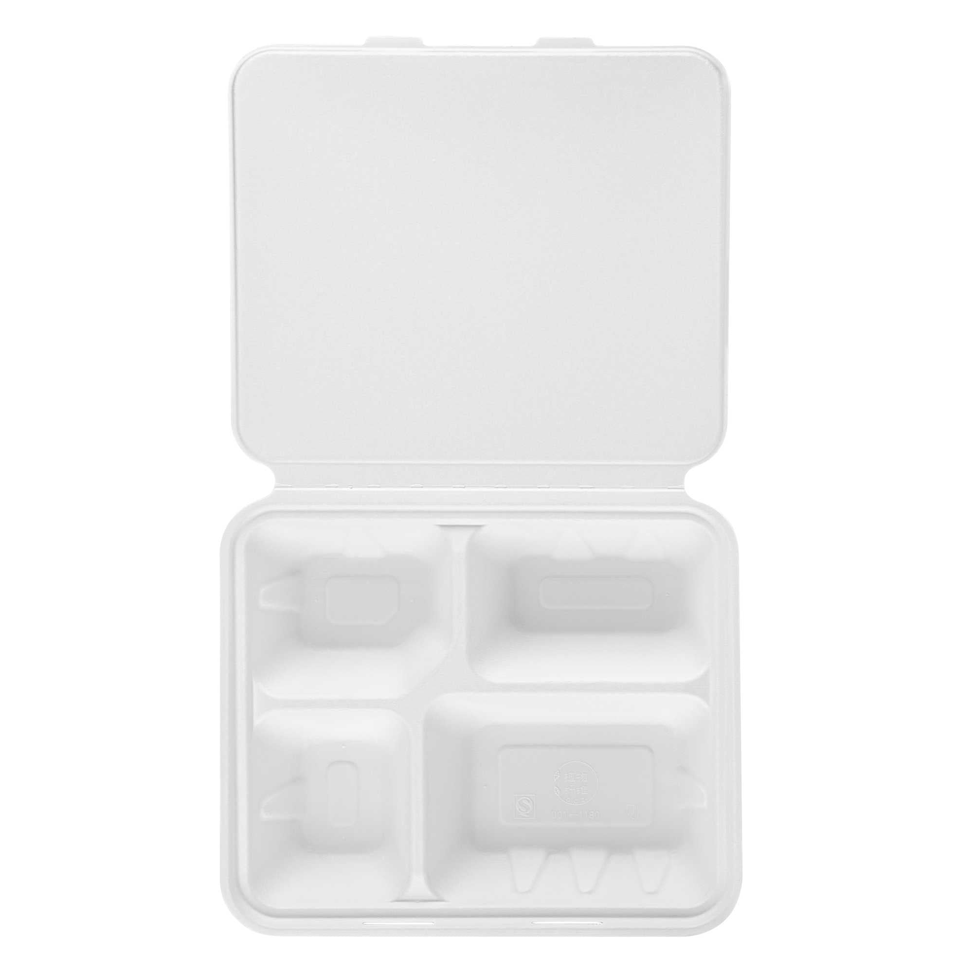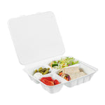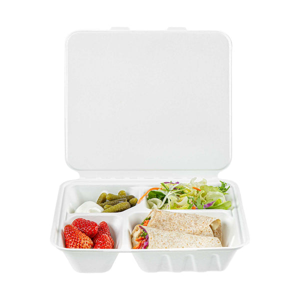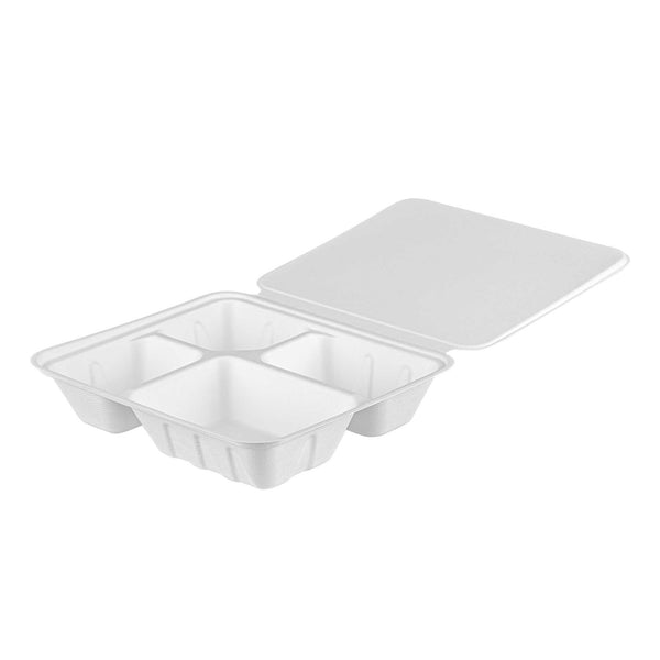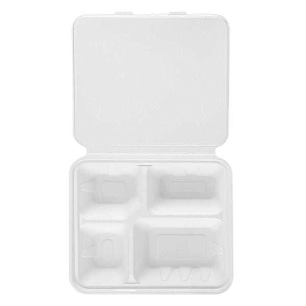 NO PFAS ADDED WHITE BAGASSE CLAMSHELL CONTAINER - 4 COMPARTMENTS