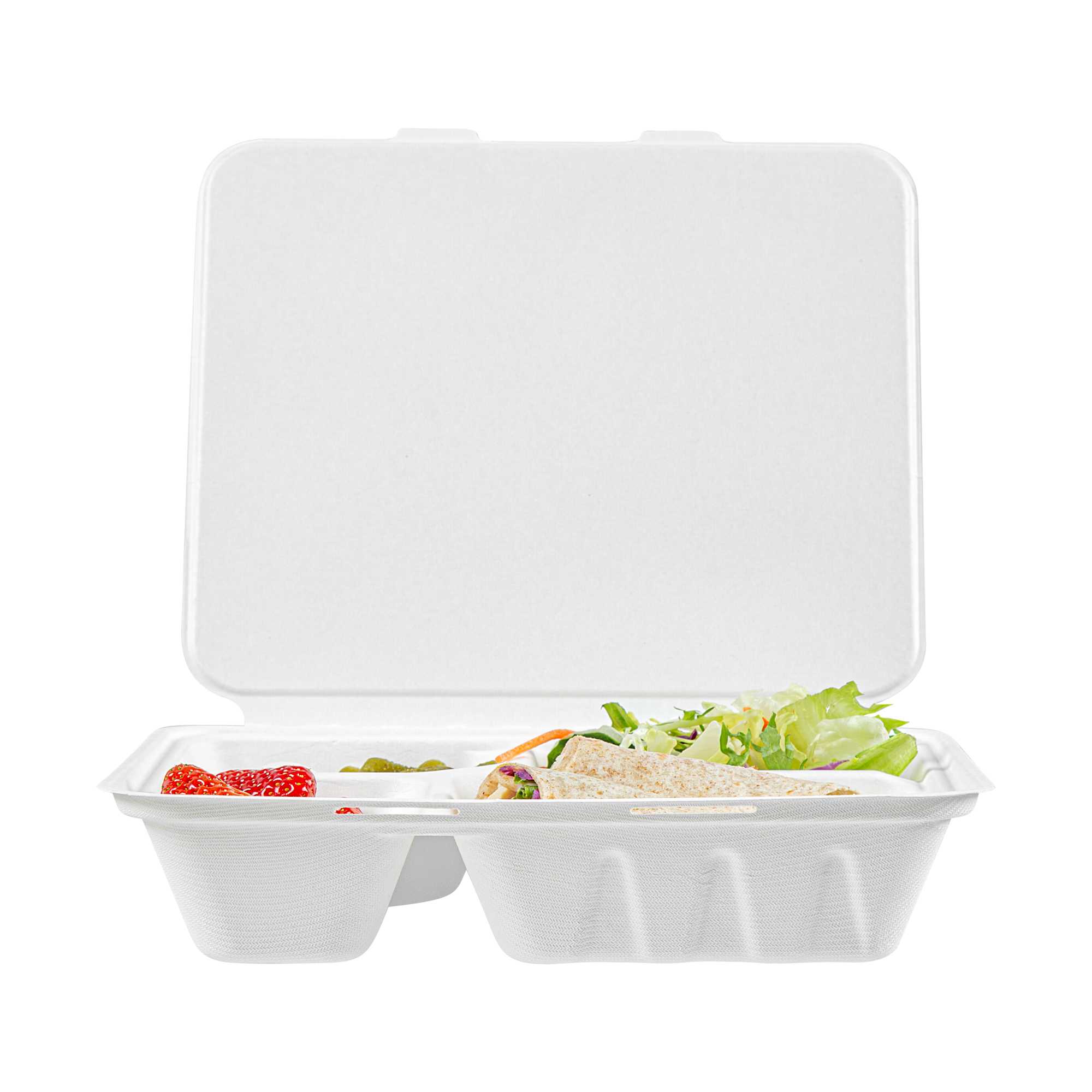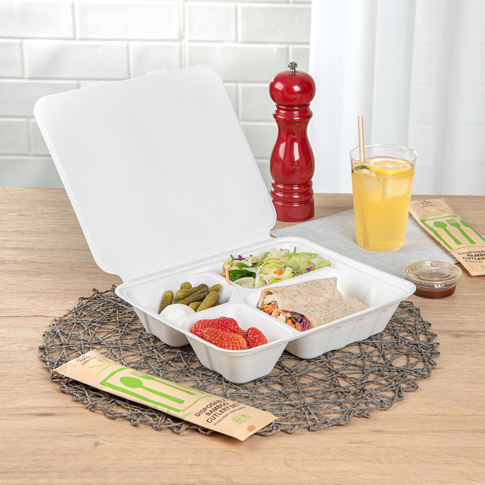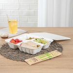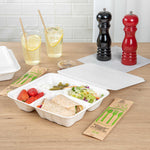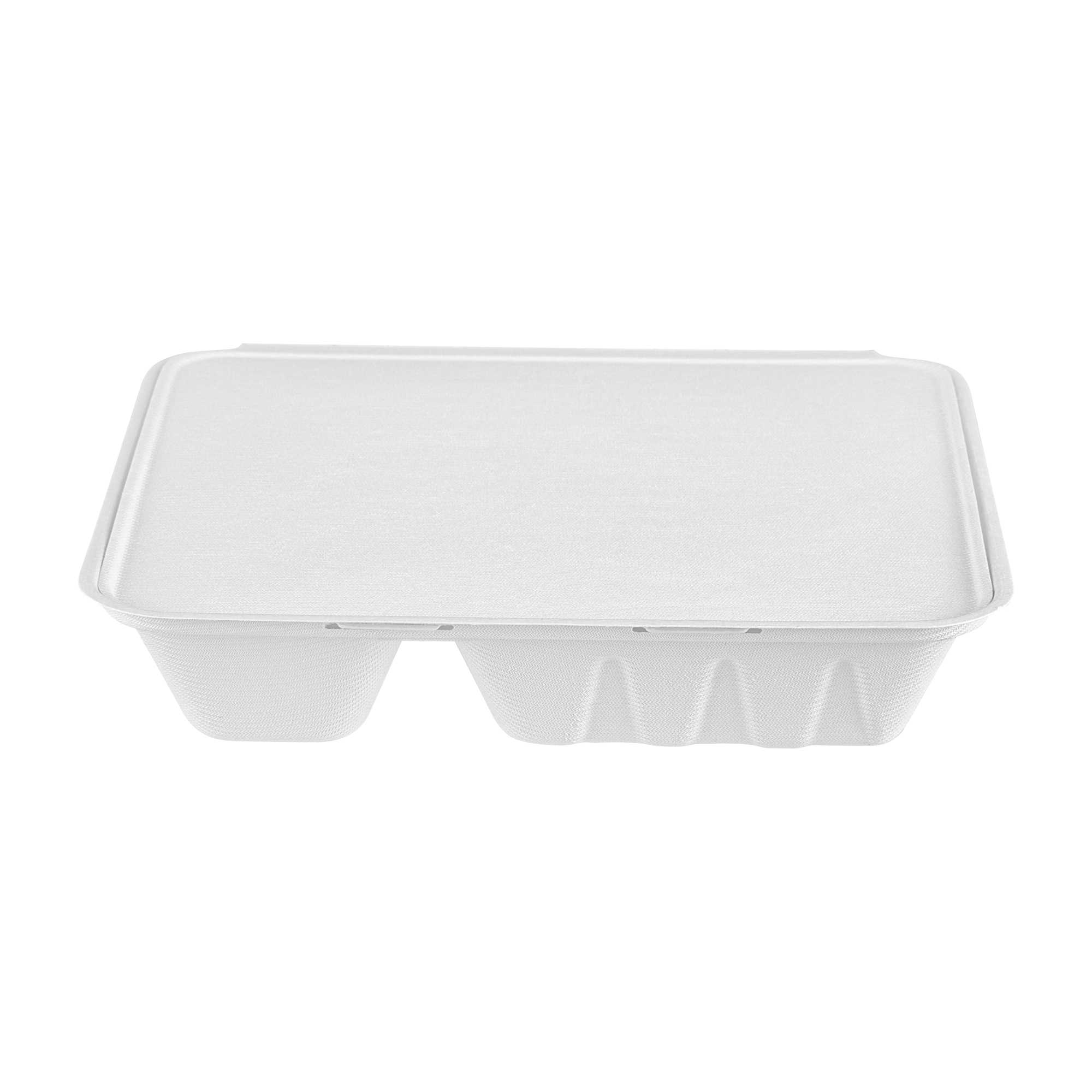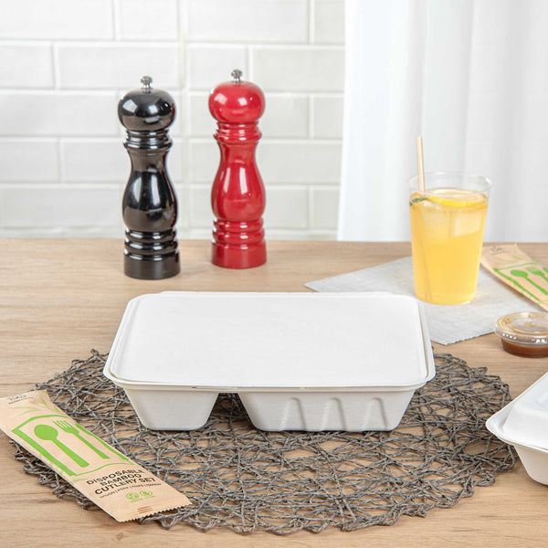 Transport meals with ease using spillage-preventing packaging. The White Bagasse take out Container features a 9.69 inches by 7.44 inches by 1.97 inches design, providing ample space for a variety of foods while its bagasse composition offers an eco-friendly alternative to traditional materials. This compartment take out box boasts a 4-compartment design that effectively separates meal components, ensuring freshness and enhancing presentation. Its microwave-friendly capability allows for quick reheating, making it ideal for busy foodservice environments. The greaseproof quality of this bagasse food container prevents leaks, promising clean and reliable transport for both hot and cold dishes. Additionally, the secure lip design of this bento-style container helps prevent spillage, maintaining the integrity of your culinary creations. Elevate your sustainability efforts while delivering exceptional service. Sold in a 200 count box.