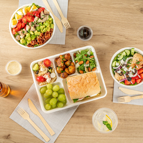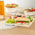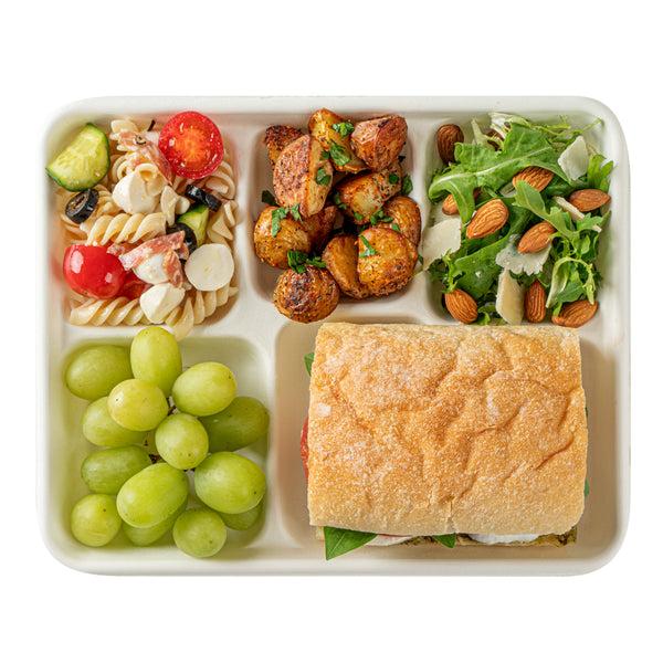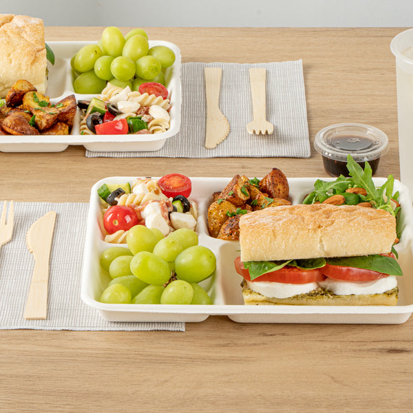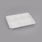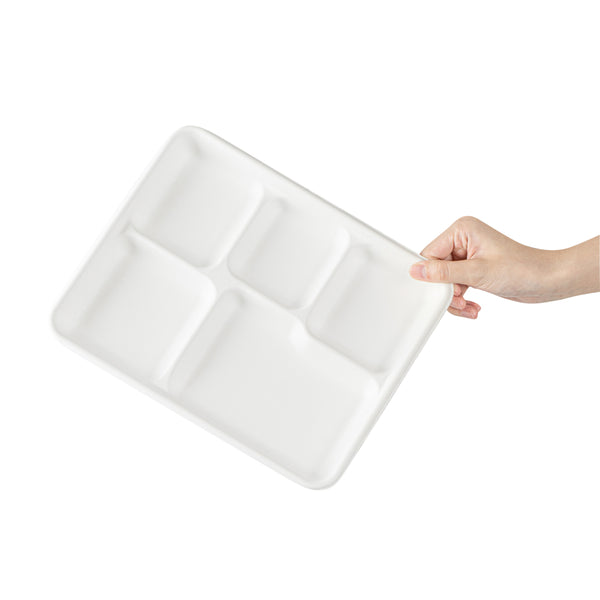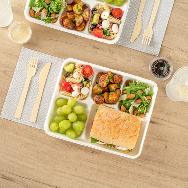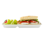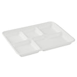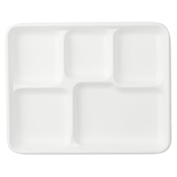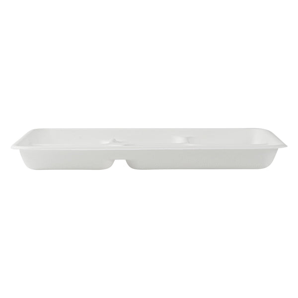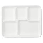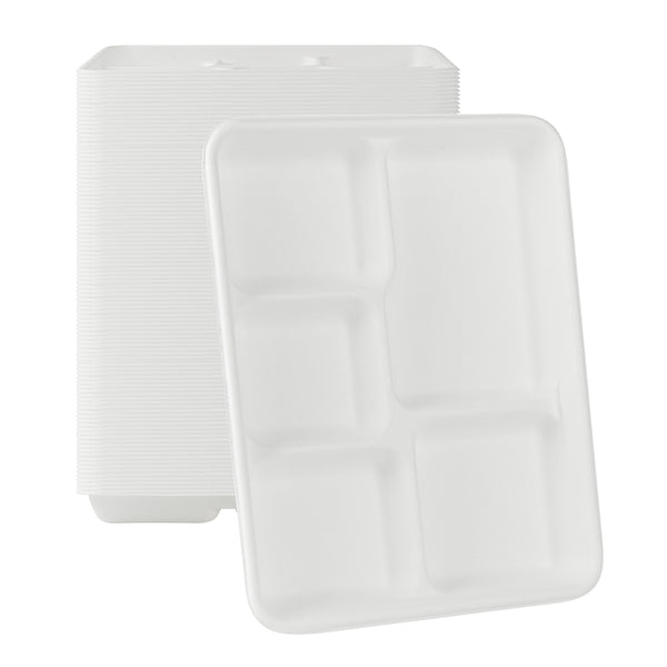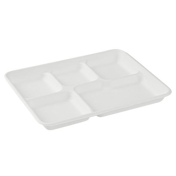 Showcase snacks for your guests with our Pulp Safe No PFAS Added Rectangle White Sugarcane / Bagasse Food Trays. Crafted to comply with stringent state regulations, these bagasse trays have no PFAS added. The 5 built-in compartments of these disposable party trays let you serve different snacks and condiments without mixing. Constructed using bagasse, these meal trays are home compostable and biodegradable. With a hot and cold friendly design, use these pulp trays to serve all kinds of foods. The freezable and microwave-safe material of these chip trays provides added convenience for reheating or refrigerating food. These snack trays won't fall apart or break easily, even when carrying heavy meals. Measuring 10.5 inches long by 8.5 inches wide by 1 inch tall, these rectangular trays are perfect for parties Shipped in a 100 count box. This item will only degrade outside of the traditional solid waste stream.