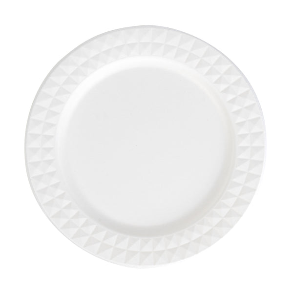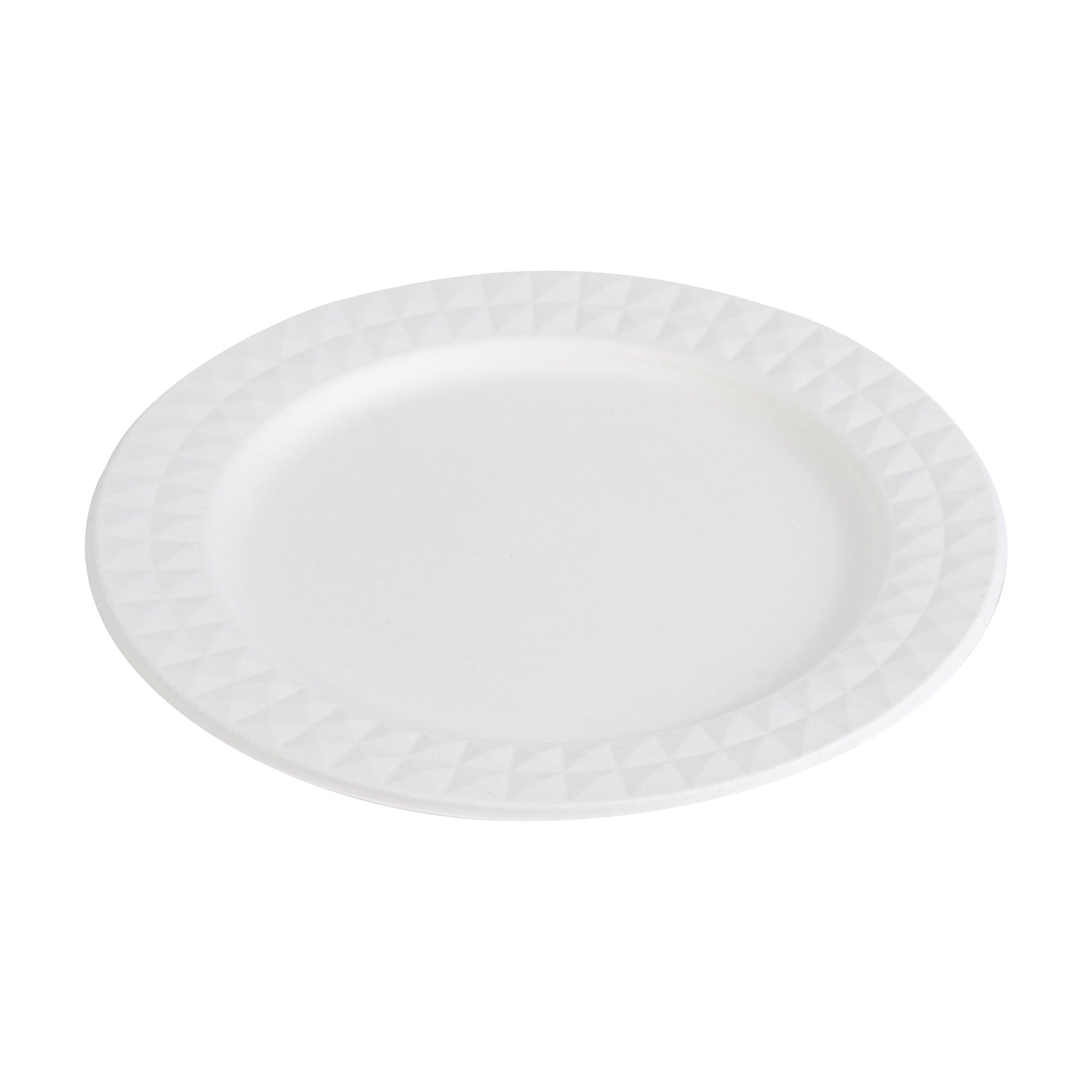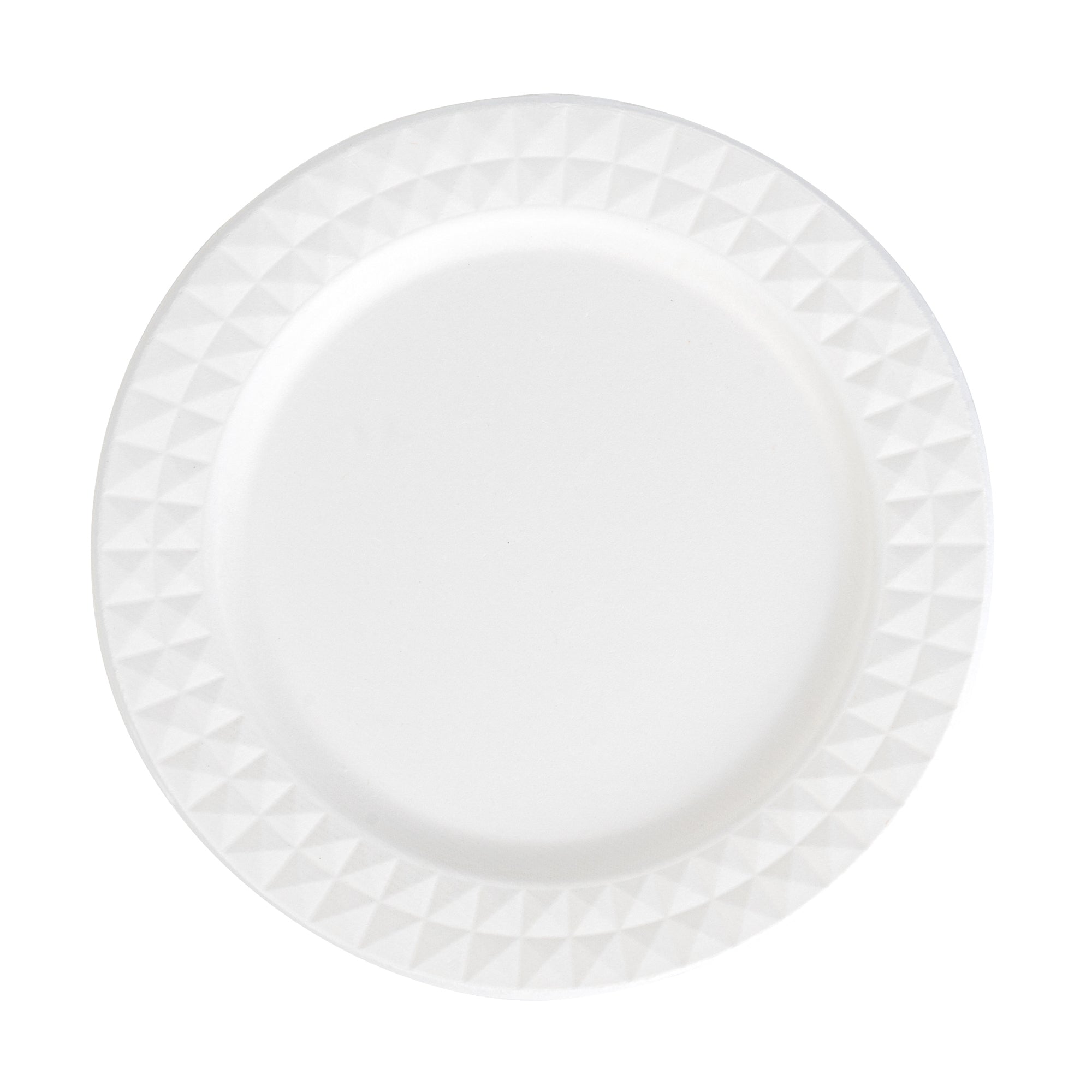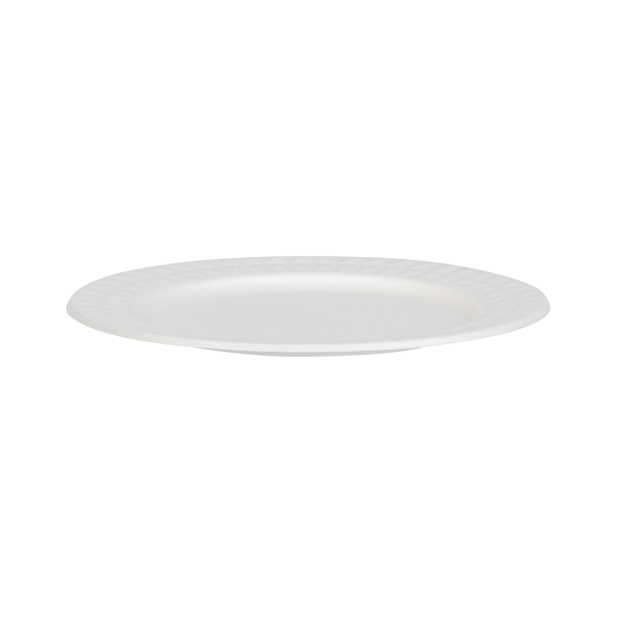Elevate your dining experience with our Pulp Safe No PFAS Added Round White Sugarcane / Bagasse Plates. These home compostable round plates contain no added PFAS, ensuring secure food consumption. Plus, they are BPI Certified for commercial composting, ensuring that they align with high sustainability standards of your eco-conscious customers. With their unique diamond rim design, these sugarcane plates are sure to enhance the presentation of your meals and make a lasting impression on your guests. Crafted from durable bagasse material, these biodegradable round plates not only add a touch of elegance but also provide a reliable solution for serving all kinds of foods. These white bagasse plates are microwavable and can be used to preheat any food. Measuring 9 inches in diameter, these disposable white dinner plates are perfectly sized for serving a variety of dishes. Sold in a 100 count box. This item will only degrade outside of the traditional solid waste stream.