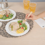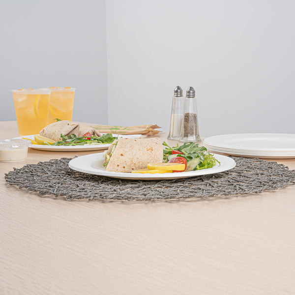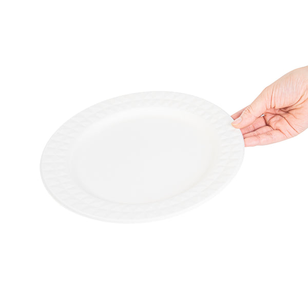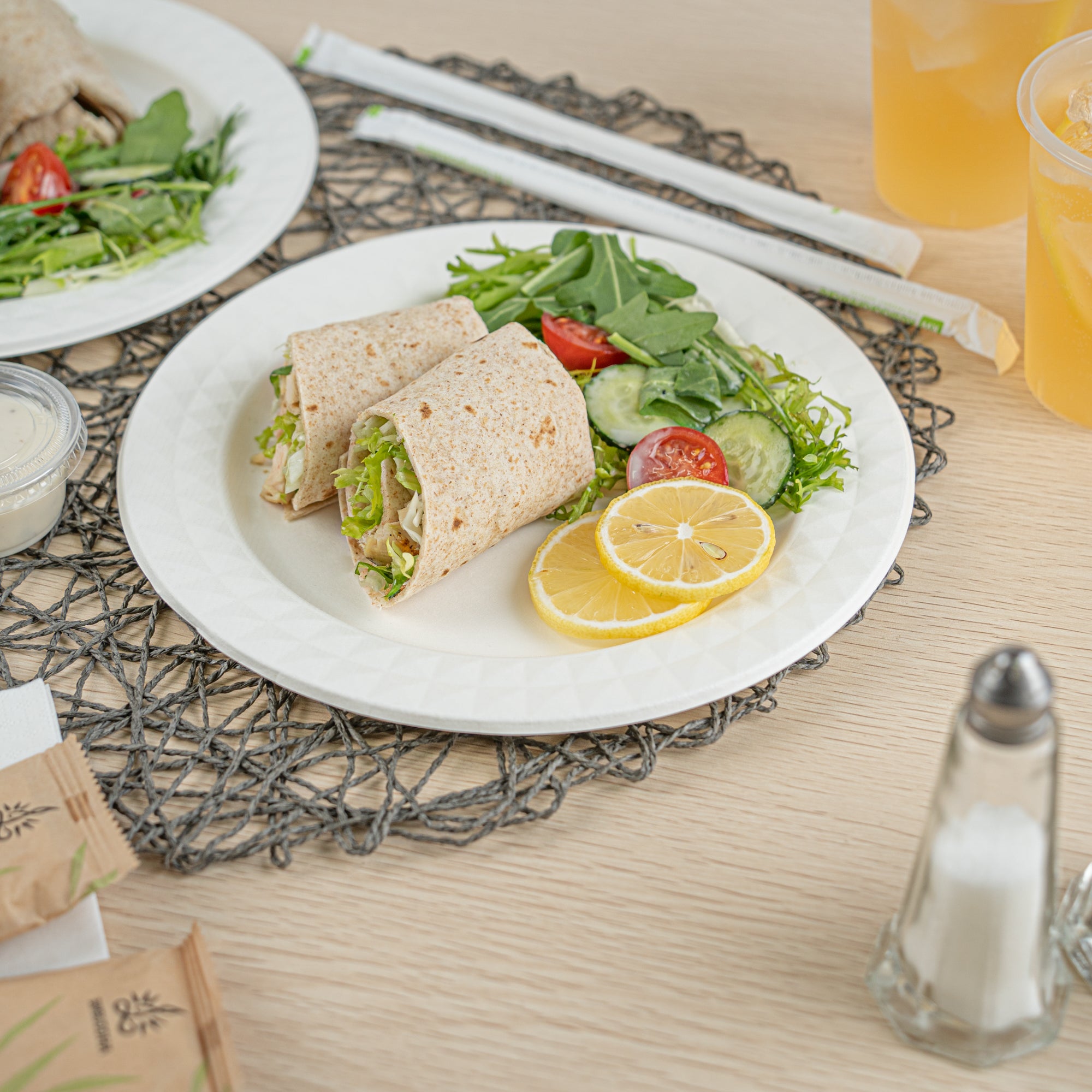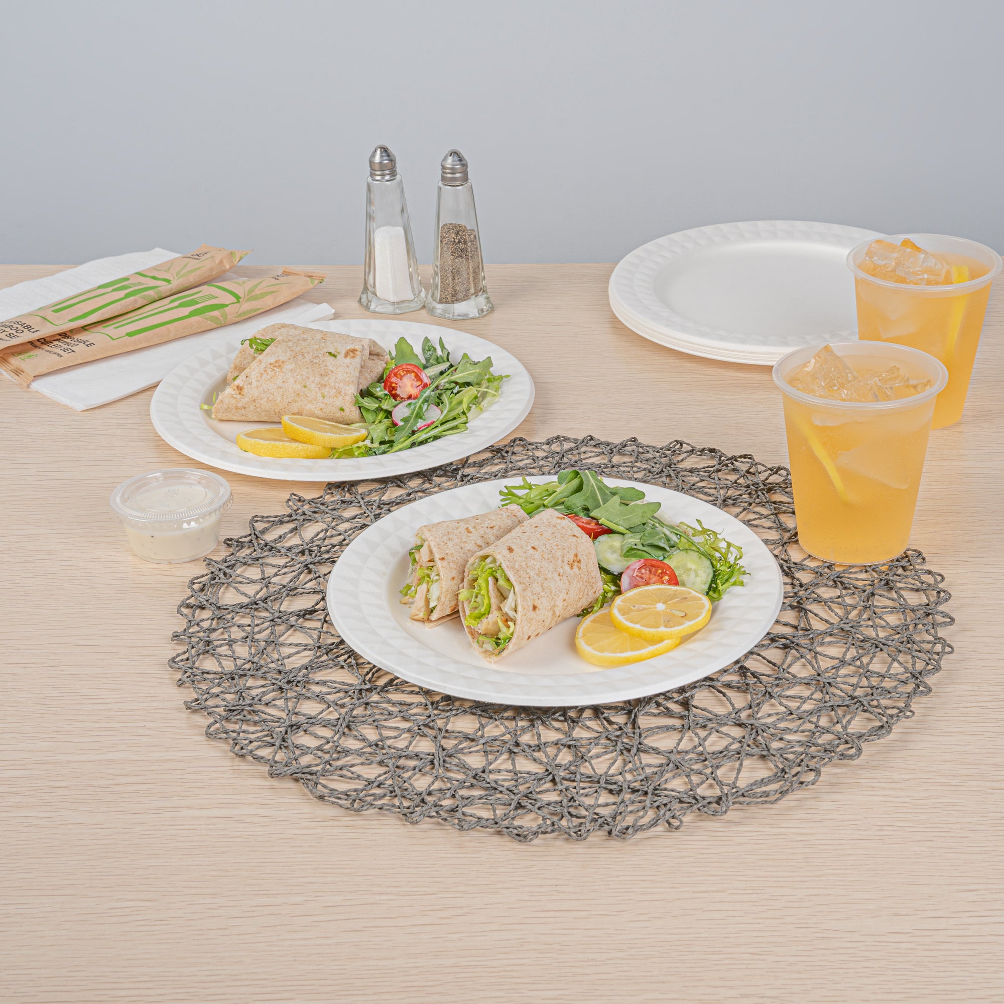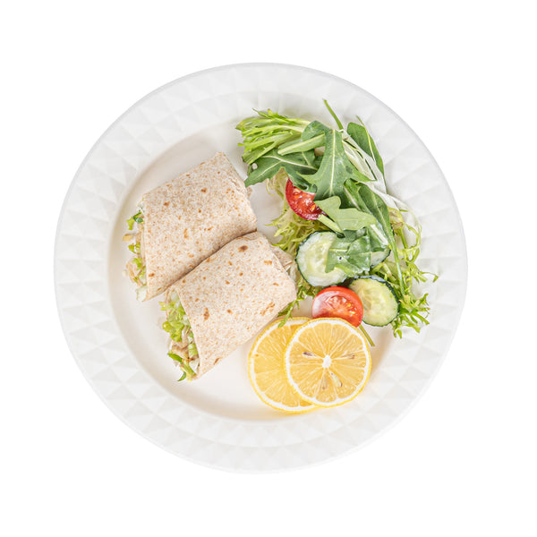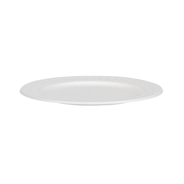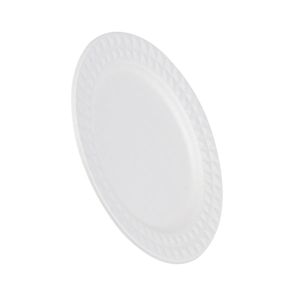 Elevate your dining experience with our Pulp Safe No PFAS Added Round White Sugarcane / Bagasse Plates. These home compostable round plates contain no added PFAS, ensuring secure food consumption. Plus, they are BPI Certified for commercial composting, ensuring that they align with high sustainability standards of your eco-conscious customers. With their unique diamond rim design, these sugarcane plates are sure to enhance the presentation of your meals and make a lasting impression on your guests. Crafted from durable bagasse material, these biodegradable round plates not only add a touch of elegance but also provide a reliable solution for serving all kinds of foods. These white bagasse plates are microwavable and can be used to preheat any food. Measuring 9 inches in diameter, these disposable white dinner plates are perfectly sized for serving a variety of dishes. Sold in a 100 count box. This item will only degrade outside of the traditional solid waste stream.