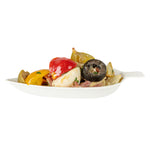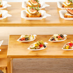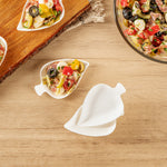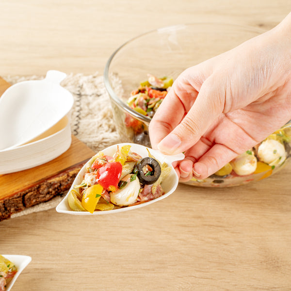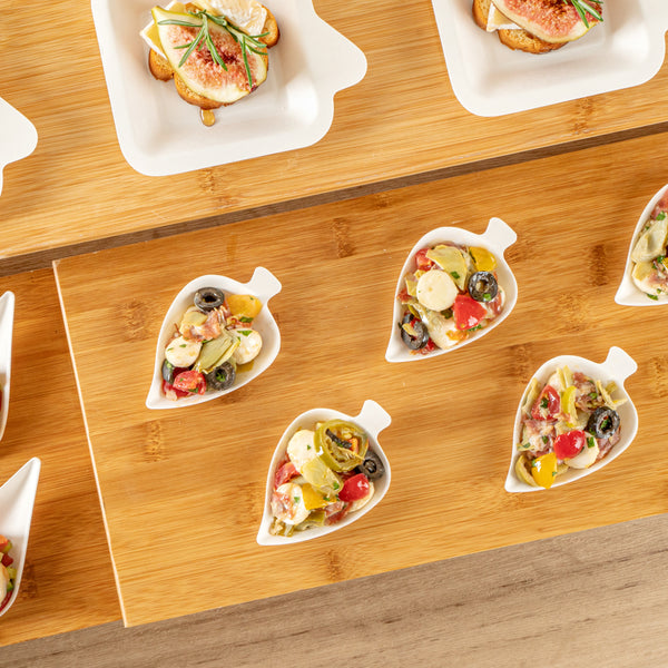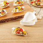 Make your food service sustainable with our Pulp Safe No PFAS Added White Sugarcane / Bagasse Leaf Tasting Dishes. To ensure customer confidence when dining, these bagasse dishes are manufactured without any added PFAS. These disposable plates are made from natural sugarcane pulp and meet the needs of eco-conscious customers by being home compostable. Designed in a leaf shape, these home compostable plates are an elegant addition to any catered event or restaurant. Suitable for all types of food, especially chilled desserts and appetizers, these biodegradable plates are freezer-safe and microwavable. With a bright white finish, these microwavable plates attract customers' attention to your delicious treats and samples. Measuring 3.75 inches long and 2.25 inches wide, these tasting dishes are perfect for serving your delectable treats. Shipped in a 100 count box. This item will only degrade outside of the traditional solid waste stream.