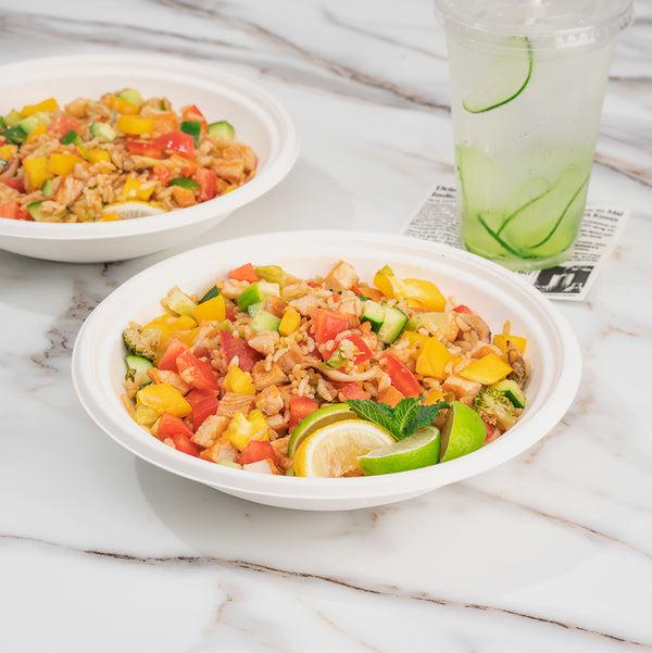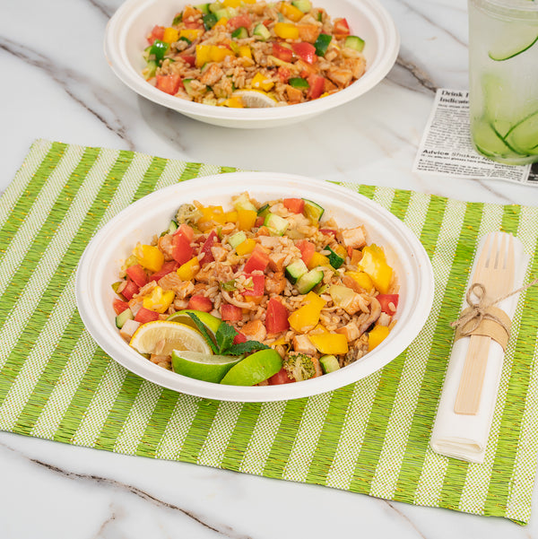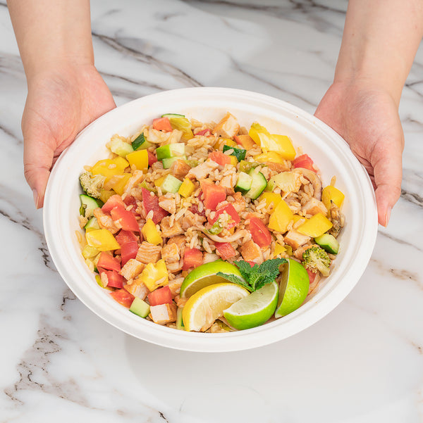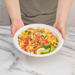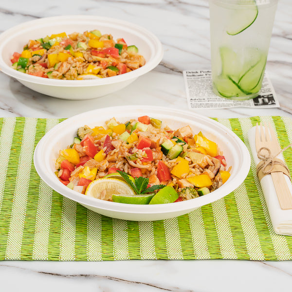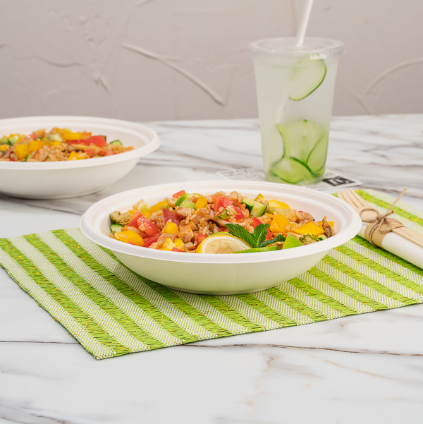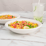 Our Pulp Tek 32-Ounce Round White Sugarcane / Bagasse Serving Bowls are perfect for serving entrees, sides, or desserts to your customers. Constructed from sustainable bagasse, a byproduct of processed sugarcane, these disposable bowls are commercially compostable and biodegradable. These commercially compostable bowls are microwave-safe and freezer-safe so you can serve all types of food at your restaurant, buffet, or catered event. To prevent oily stains, these sugarcane bowls are grease-resistant. Featuring a white finish, these bagasse bowls make the colors of your fare pop to create an appetizing look. The round shape of these white serving bowls provides ample space for multiple entrees. Measuring 9 inches in diameter and 2 inches in height, these disposable serving bowls contain up to 32 ounces. Sold in a 100 count box. This item will only degrade outside of the traditional solid waste stream.