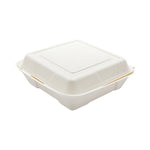 Bring sustainability to your carryout services using our Pulp Tek 32-ounce Square/Bagasse Large Clamshell Containers. Crafted from all-natural sugarcane fibers, these disposable food containers are biodegradable and commercially compostable, providing you with an eco-friendly and hassle-free way to clean up after service hours. Featuring a hinged lid, these clamshell trays are perfect for keeping large food orders safe during delivery. Conveniently freezer-safe and microwave-safe, these eco-friendly to go boxes are ideal for storing hot or cold dishes and reheating meals. These grease-resistant containers are great for preventing the grease or oils from chicken wings, sandwiches, hot dogs, and other tasty dishes from seeping through. Measuring 9.2 inches in length by 9.25 inches in width and 3.25 inches in height when closed, these disposable food containers are shipped in a 100 count box. This item will only degrade outside of the traditional solid waste stream.