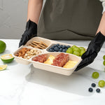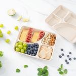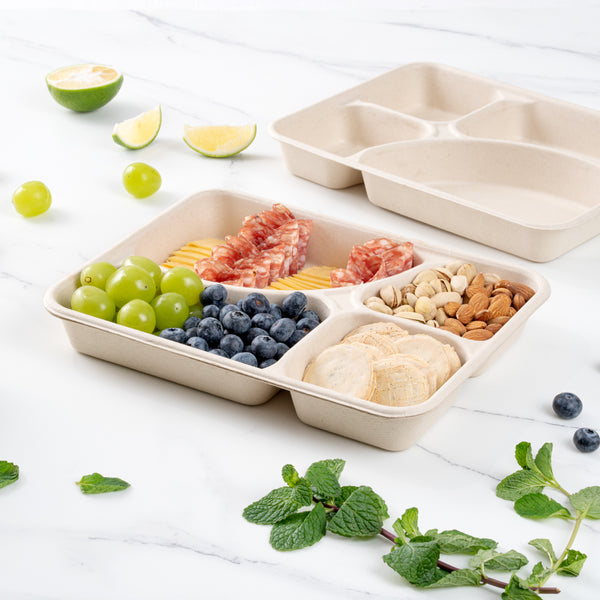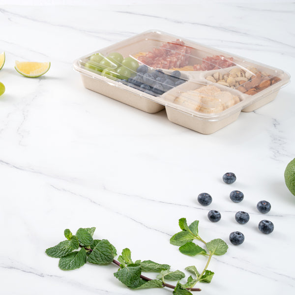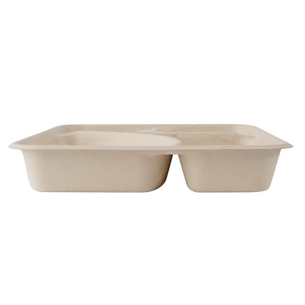 Use our Pulp Tek 43-ounce Rectangle Natural Sugarcane / Bagasse To Go Trays to organize guests' to go orders. These bagasse trays are constructed from natural sugarcane fibers and can be commercially composted and biodegraded as opposed to traditional to go containers. Featuring a 4 compartment layout, these eco-friendly food containers are convenient for separating entrees and side dishes. These biodegradable food containers are grease-resistant to stop oils and grease from leaking through and making a mess. Conveniently microwave-safe and freezer-safe, these disposable food containers allow customers to store and reheat their leftovers. Match these 4-compartment food trays with our compatible lid to lock in ingredients' freshness and eliminate messes (SKU: RWA1004K & RWA1005C). These biodegradable food containers have a total measurement of 11 inches in length by 8.5 inches in width by 1.5 inches in height and can contain up to 43 ounces. Easily pack entrees in the large compartment that can contain up to 17.2 ounces, and the medium compartment that holds up to 10.75 ounces. The 2 smaller compartments can contain up to 7.5 ounces, making them ideal for dividing sides or snacks. Sold in a 100 count box. This item will only degrade outside of the traditional solid waste stream. Lids are available and sold separately.