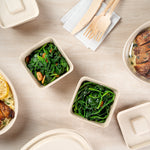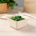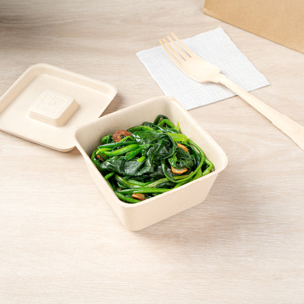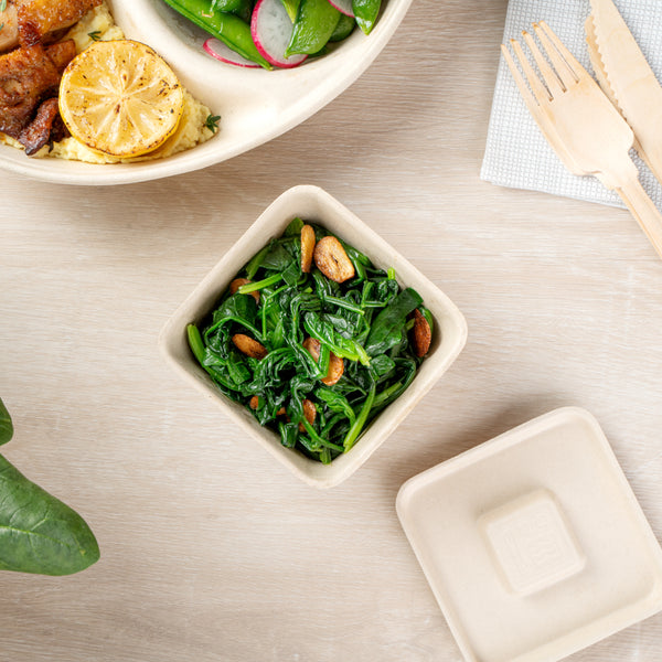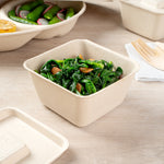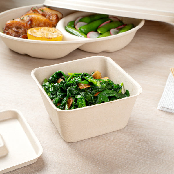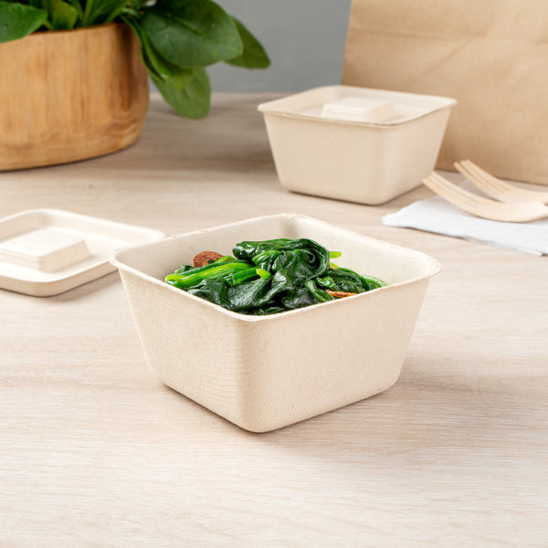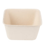 Use our Pulp Tek 9-ounce Square Natural Sugarcane / Bagasse Bowls to package customers' delivery or take out orders. To promote a positive impact on the planet, these bagasse bowls are crafted from repurposed sugarcane that is commercially compostable and biodegradable. These sugarcane bowls are durable and grease-resistant to hold hefty meals without having oils leak through. To easily store grab-and-go items and heat up food, these sustainable bowls are freezable and microwavable. Coordinate these bowls for hot foods with lids to conveniently take meals on the go (SKU: RWA0996K). These pulp bowls have a total diameter of 3.75 inches by 2 inches in height and contain up to 9 ounces. Sold in a 100 count box. This item will only degrade outside of the traditional solid waste stream. Compatible Pulp Tek lids are available and sold separately.
