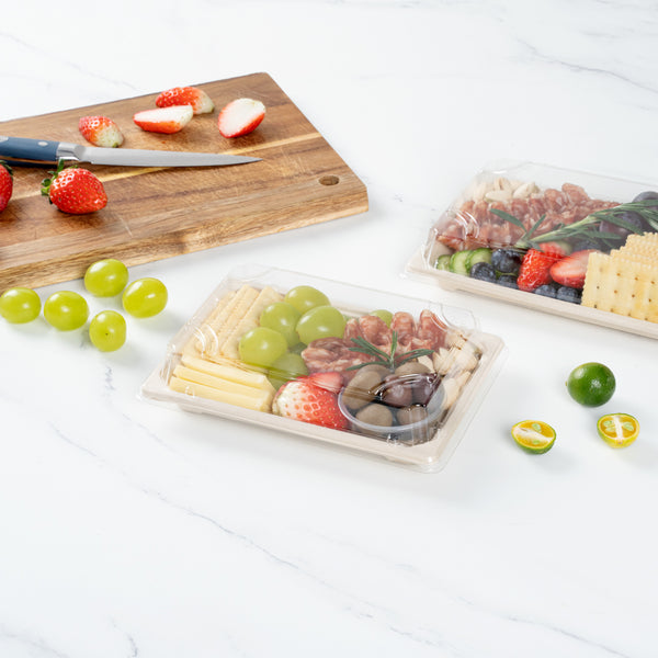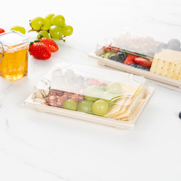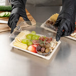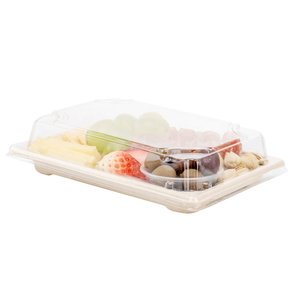 Deliver your fare without any mess using our Pulp Tek Rectangle Clear Plastic Lids. Combine these clear lids with our matching medium sushi trays to keep your rolls securely contained (SKU: RWA1034K). Designed with a crystal-clear finish, these plastic dome lids are anti-fog to decrease condensation and increase clarity for quick identification. Crafted from premium PET plastic, these food container lids are leak-resistant, making them perfect for packaging deep-fried or saucy foods. With an extended rim, these PET dome lids can be easily taken off trays to access meals in no time. Featuring a dome shape, these clear lids allow you to vertically fill up trays to provide customers with large meals. To reduce your carbon footprint, these food container lids are recyclable. These transparent lids measure 7.25 inches long by 5 inches wide by 1.25 inches tall. Sold in a 100 count box. Compatible Pulp Tek sushi trays are available and sold separately.