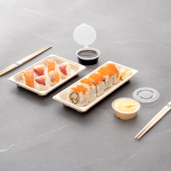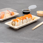 Create unforgettable sushi presentations with our Pulp Tek Rectangle Natural Sugarcane / Bagasse Long Sushi Trays. Pair these catering trays with our clear plastic lids to take food on the go (SKU: RWA1031C). Made from bagasse, a byproduct of repurposed sugarcane, these food serving trays are biodegradable and commercially compostable to reduce the carbon footprint of your foodservice establishment. Not to mention, they are microwavable and freezable for reheating or storing leftovers. With a rectangle design, these catering serving trays are perfect for holding several of your California rolls. The natural brown finish of these disposable food trays gives your presentation a rustic and irresistible look. To save space in your storage area, these bagasse food trays are stackable. These sugarcane plates measure 8.75 inches long by 3.25 inches wide. Sold in a 100 count box. This item will only degrade outside of the traditional solid waste stream. Lids are available and sold separately.