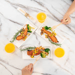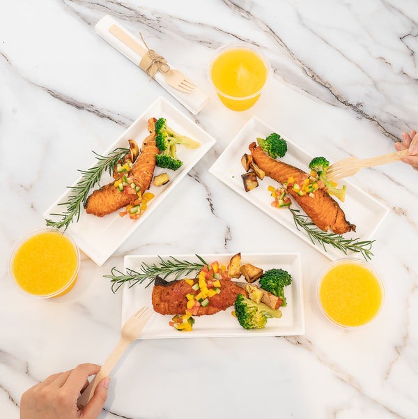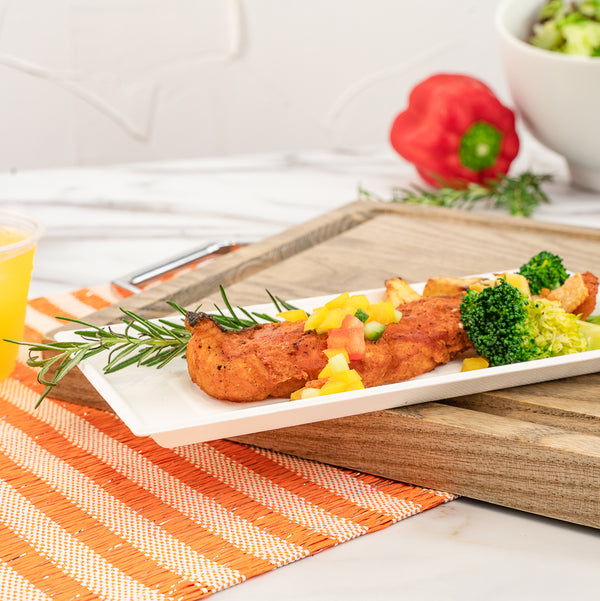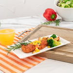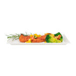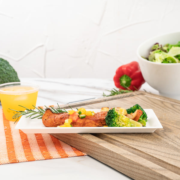 Serve guests delicious pasta with our Pulp Tek Rectangle White Sugarcane / Bagasse Modern Plates. Constructed from processed sugarcane, these commercially compostable plates are commercially compostable and biodegradable for an eco-friendly clean up after use. Perfect for avoiding messes, these biodegradable plates are grease-resistant to keep oils from seeping through and creating stains. These sugarcane plates are microwave-safe and freezer-safe for keeping food fresh and reheating meals. The stylish rectangle design allows you to display fare with style. Featuring a white finish, these bagasse plates highlight the colors of your fresh caesar salads. These rectangle plates measure 9.5 inches long by 4.25 inches wide by 0.5 inches tall. Sold in a 100 count box. This item will only degrade outside of the traditional solid waste stream.