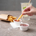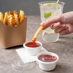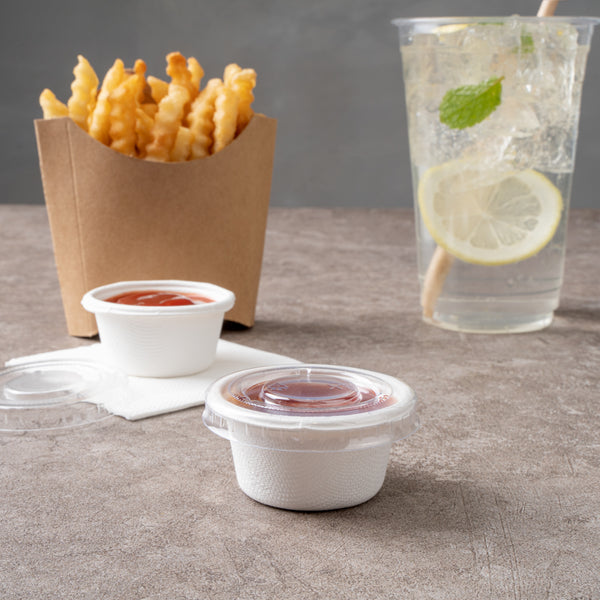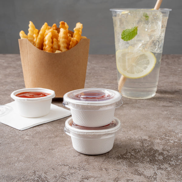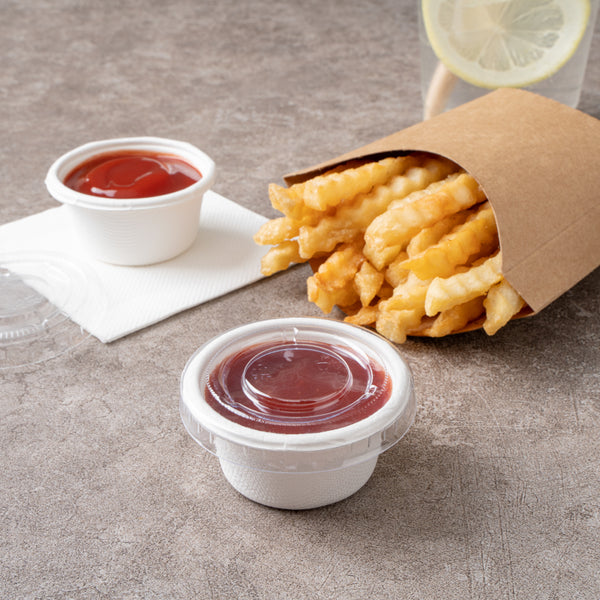 Securely seal your sauces with our Pulp Tek Round Clear Plastic Lids. Match our 2-ounce portion cups with lids to avoid messy spills while transporting salad dressings or condiments. Perfect for to go orders, these lids have a tight-fitting seal to easily cover your mustard and ketchup sauces. Featuring a clear finish, these dressing cup lids allow customers to quickly identify condiments. Crafted from PET plastic, these sauce cup lids are recyclable to reduce the carbon footprint at your restaurant, deli, or food truck. Plus, these durable lids are strong and sturdy to keep your condiments protected. These souffle cup lids measure 2.44 inches in diameter. Sold in a 2,000 count box. Portion cups (SKU: RWA0941W) are available and sold separately.