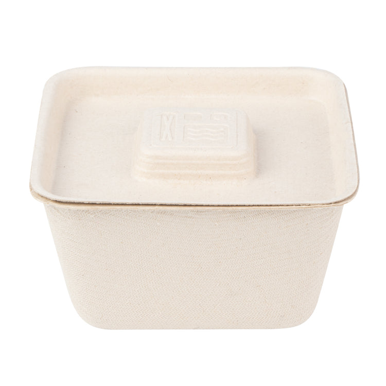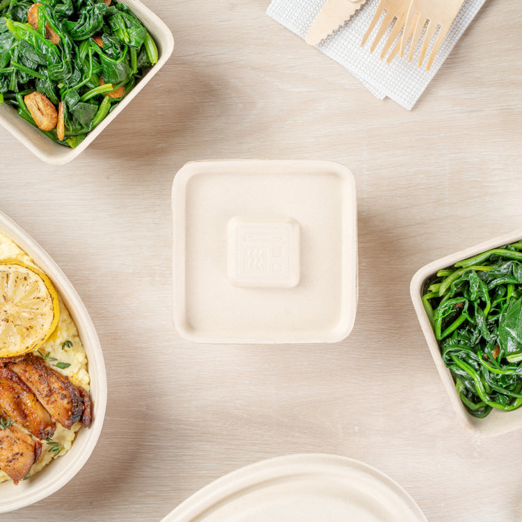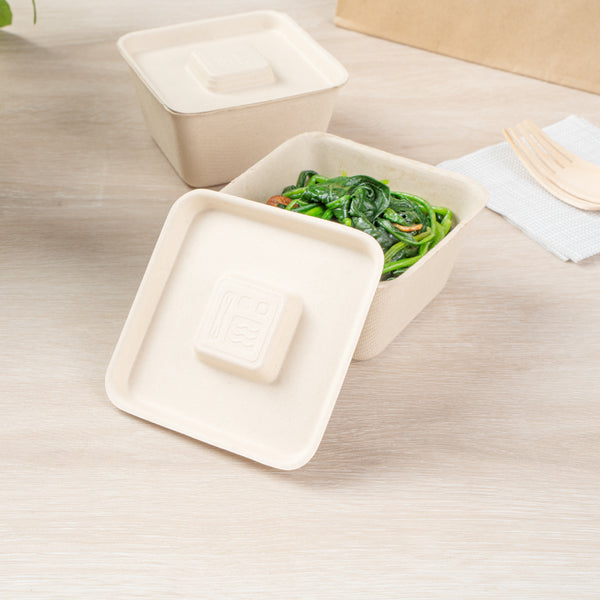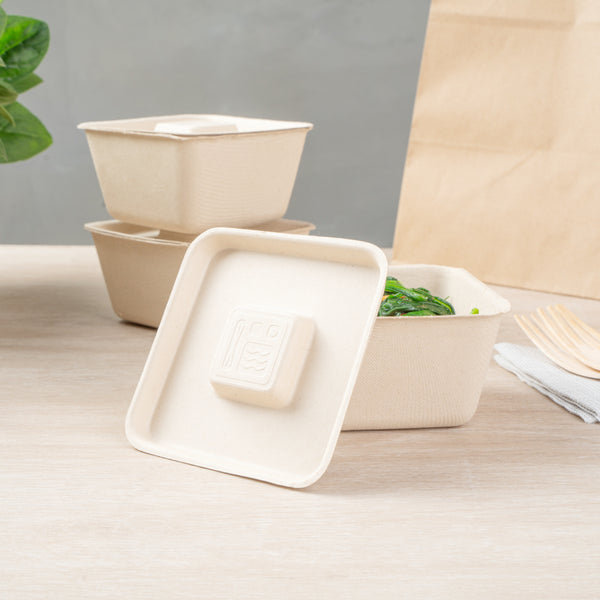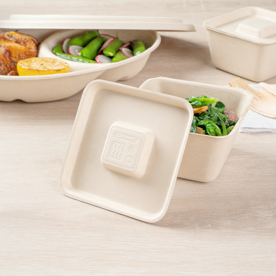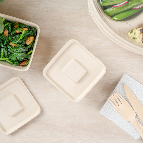 Keep meals securely covered using our Pulp Tek Square Natural Sugarcane / Bagasse Flat Lids. Pair our bagasse food containers with lids to ensure to go meals are reliably contained during transport (SKU: RWA0995K). Constructed from sugarcane fibers, these bagasse lids are commercially compostable and biodegradable to provide a sustainable alternative to conventional take out lids. To prevent oils from leaking through and maintain the appearance of take out orders, these durable container lids are grease-resistant. These repurposed lids are freezable and microwavable to conveniently store packaged meals and reheat orders before serving. Measuring 3.7 inches in diameter, these to go container lids are stackable for space-saving storage. Sold in a 100 count box. This item will only degrade outside of the traditional solid waste stream. Compatible Pulp Tek containers are available and sold separately.