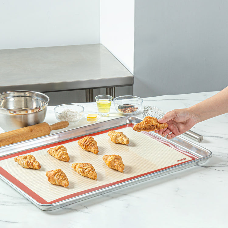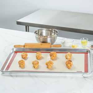 Eliminate the unnecessary waste and expense of parchment paper by switching to Restaurantware's Ultra Durable Pastry Tek Silicone Baking Mat. Made from naturally non-stick silicone, this eco-friendly silicone oven mat is a perfect option for chefs and bakers who are looking to streamline their prep and baking. This durable non-stick baking mat expertly prevents food from sticking -- eliminating the need for greasing pans with oil or fat! In addition, this full sheet silicone pastry mat provides consistent heat distribution to produce perfectly baked cookies, macarons, casseroles, quiches, and more. Compatible with full-size sheet pans, this large silicone mat can endure temperatures between -40 to 480F and measures 15.8 inches in width by 23.6 inches in length. Sold in a 1 count box.