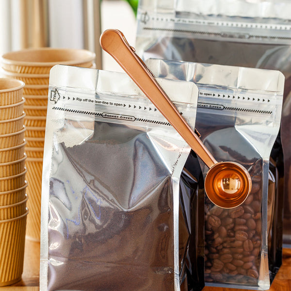 Enhance your coffee service with a versatile measuring tool. The Restpresso 1 Tbsp. Copper-Plated Stainless Steel Coffee / Measuring Scoop combines functionality with elegance, featuring a copper-plated stainless steel construction that not only adds durability but also elevates the presentation of your coffee offerings. This coffee measuring spoon includes a built-in bag clip, ensuring your coffee or sugar bags remain sealed for maximum freshness, a crucial benefit for maintaining flavor profiles in cafes and restaurants. With its 1 tablespoon capacity, this stainless steel coffee scoop allows for precise and consistent measurements, crucial for extracting optimal coffee flavors. Its dishwasher-safe design ensures quick, efficient cleaning, making it a practical tool for busy foodservice environments. The compact size, measuring 6.87 inches in length, fits effortlessly into bags or storage containers, aiding in space-saving in small kitchen areas. Sold in a 1 count box.