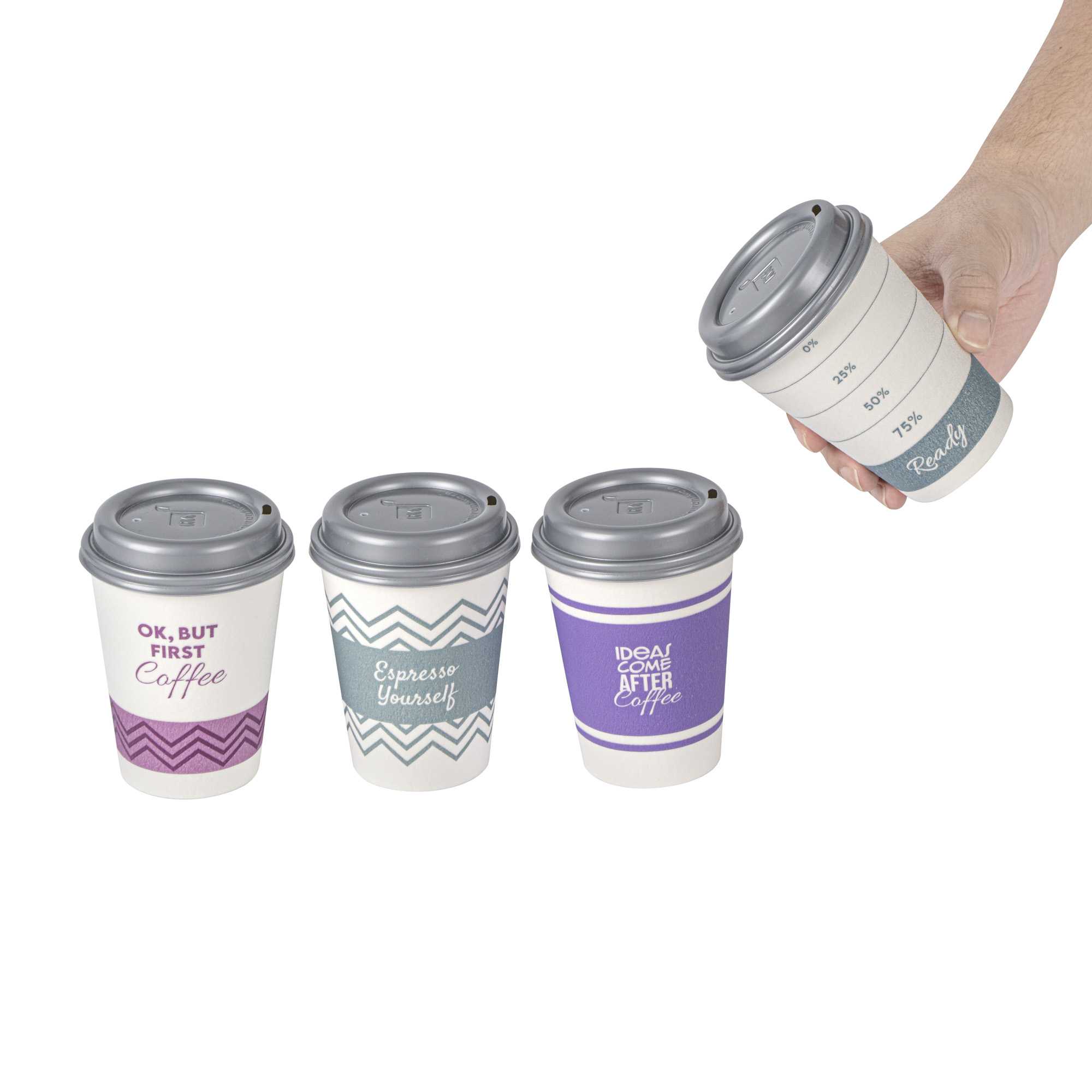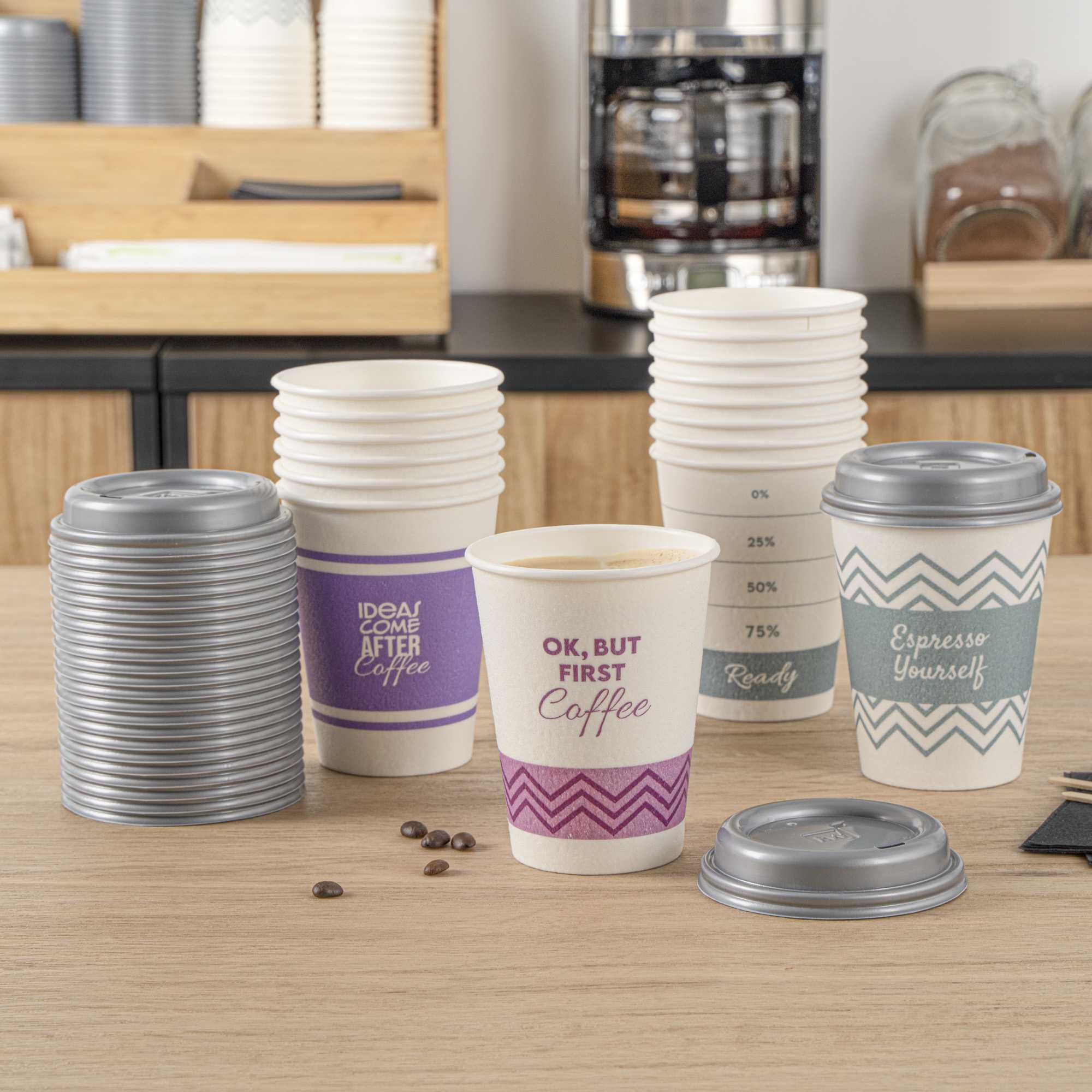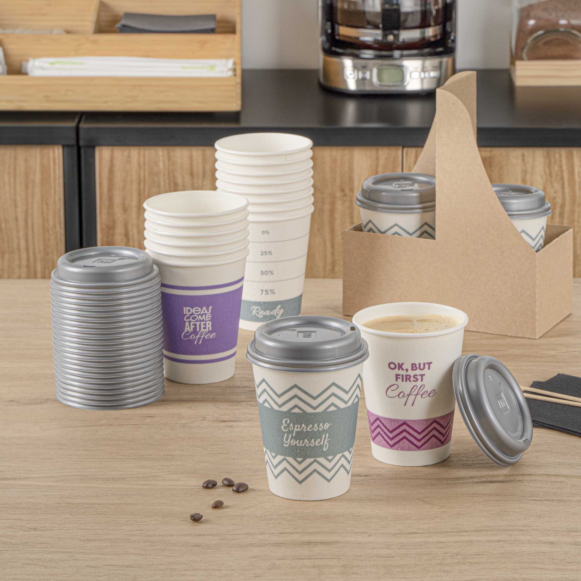 Keep beverages piping hot with our Restpresso 12 oz Assorted Paper Insulated Hot Cup Set. The assorted cups are designed with a single wall construction that reduces the need for costly double-cupping. Featuring a non-slip exterior, these paper cups ensure a secure hold while serving hot beverages, enhancing the efficiency of your service. The included lids of these paper takeaway cups help maintain drink temperatures for longer periods, making them perfect for orders on the go. Enhance your takeaway offerings with these versatile and cost-efficient disposable hot cups that simplify storage and ordering. Measuring 2.32 inches in diameter and 4.68 inches in height, these cups are an ideal solution for busy cafes and casual dining establishments. Sold in a 100 count box.