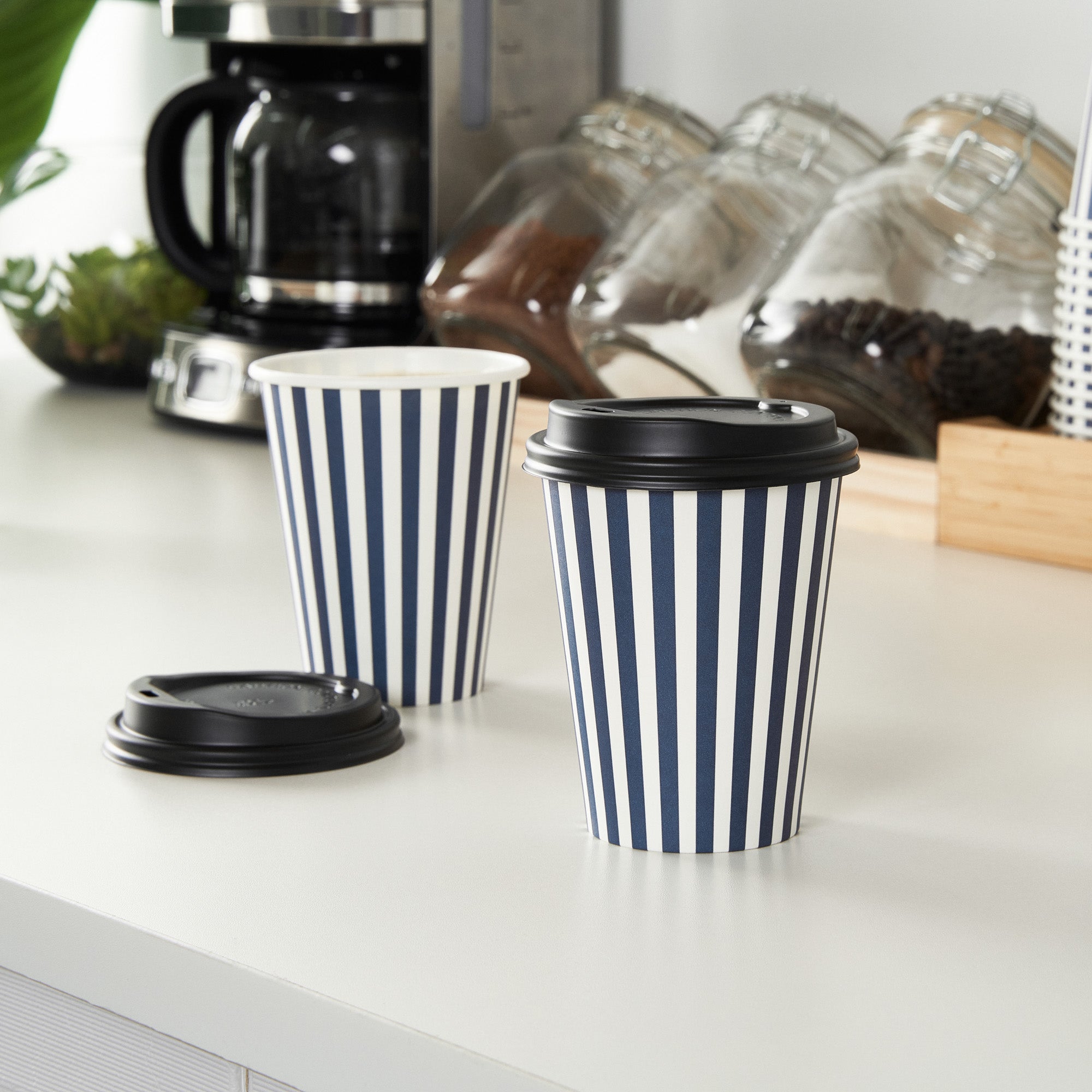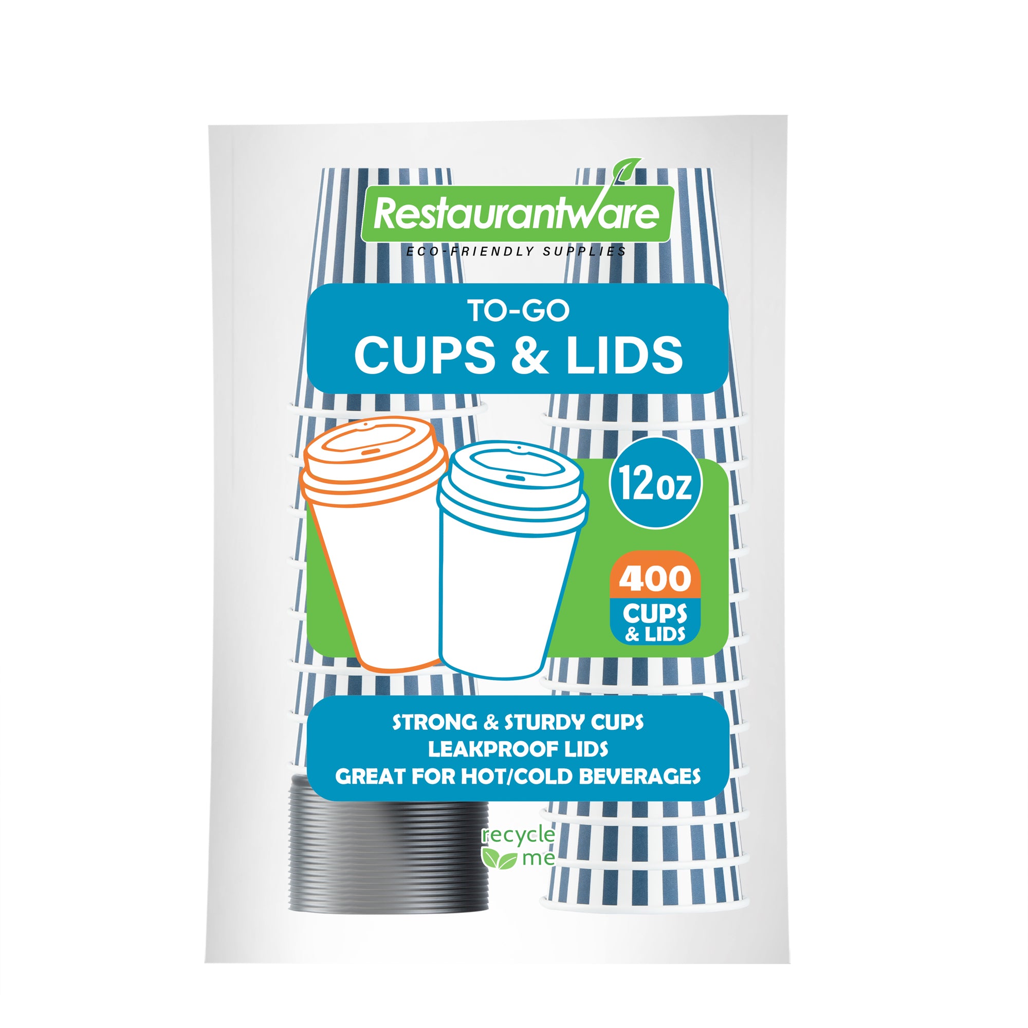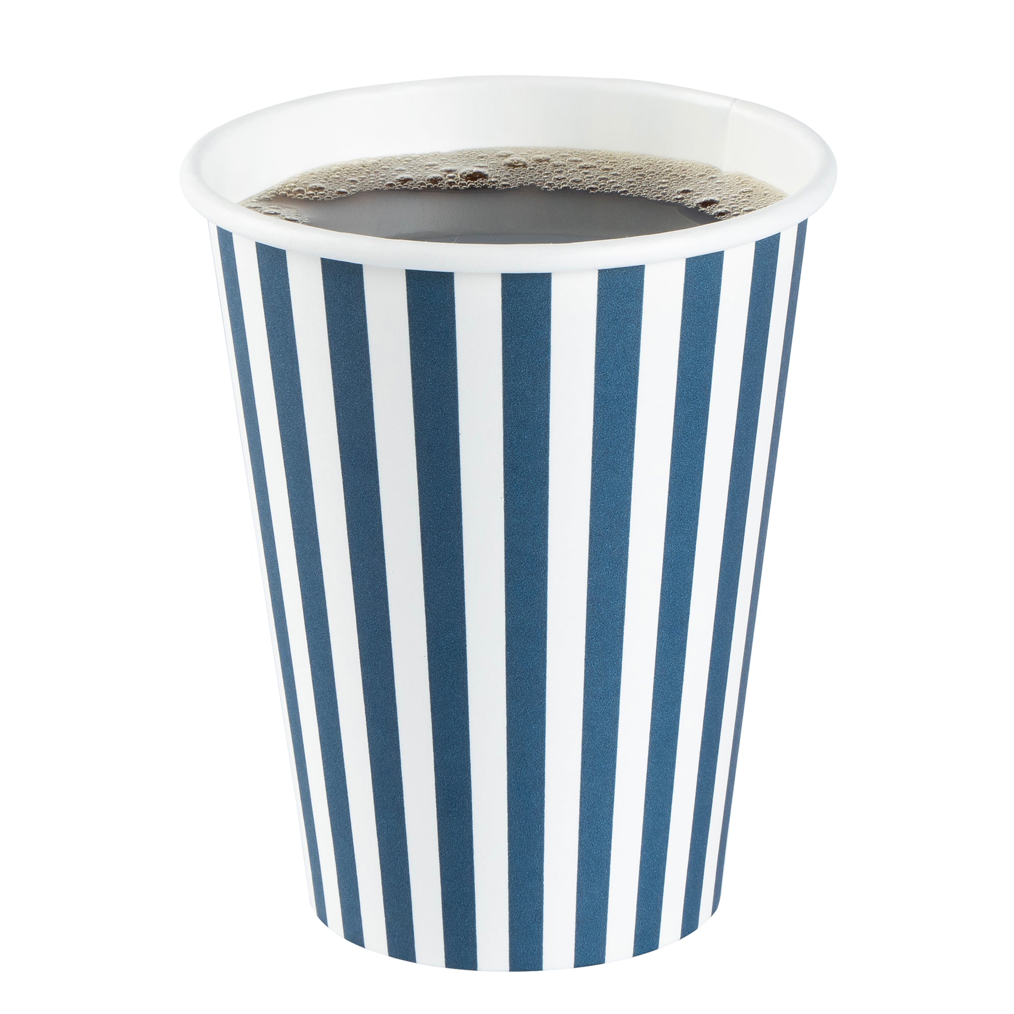 Savor your favorite brews with our Restpresso 12-ounce Blue and White Stripe Paper Single Wall Coffee Cups. Designed for hot and cold beverages, these single-use coffee cups are versatile additions to your cafe, bakery, or food truck. The greaseproof PE liner inside these paper coffee cups ensures your drinks remain leak-free and delicious. Perfectly designed for coffee lovers on the go, these disposable hot cups come with a secure black lid to reduce spills and leaks. Flaunting a charming blue and white striped finish, these coffee cups will leave a lasting impression on your customers. Crafted with a single wall, these coffee cups are suitable for all kinds of drinks. With a rolled rim and leak-resistant seam, these stackable coffee cups ensure a premium drinking experience for your customers. Blend these vibrant coffee cups with our diverse sleeve options, ensuring a colorful and heat-resistant coffee routine. Boasting a generous capacity of 12 ounces, these recyclable hot tea cups are ideal for serving medium-sized beverages. Measuring 3.5 inches in diameter and 4.5 inches in height, these disposable hot cups are compact yet spacious enough to accommodate your delicious lattes, cappuccinos, or teas. Sold in a 400 count box. Sleeves are available and sold separately.