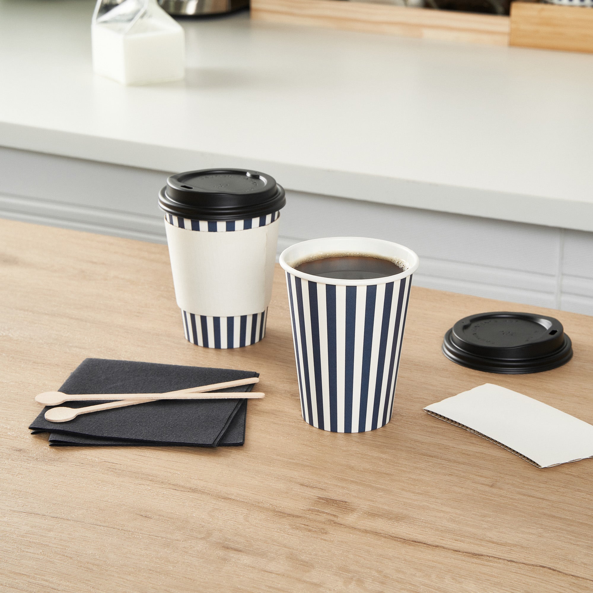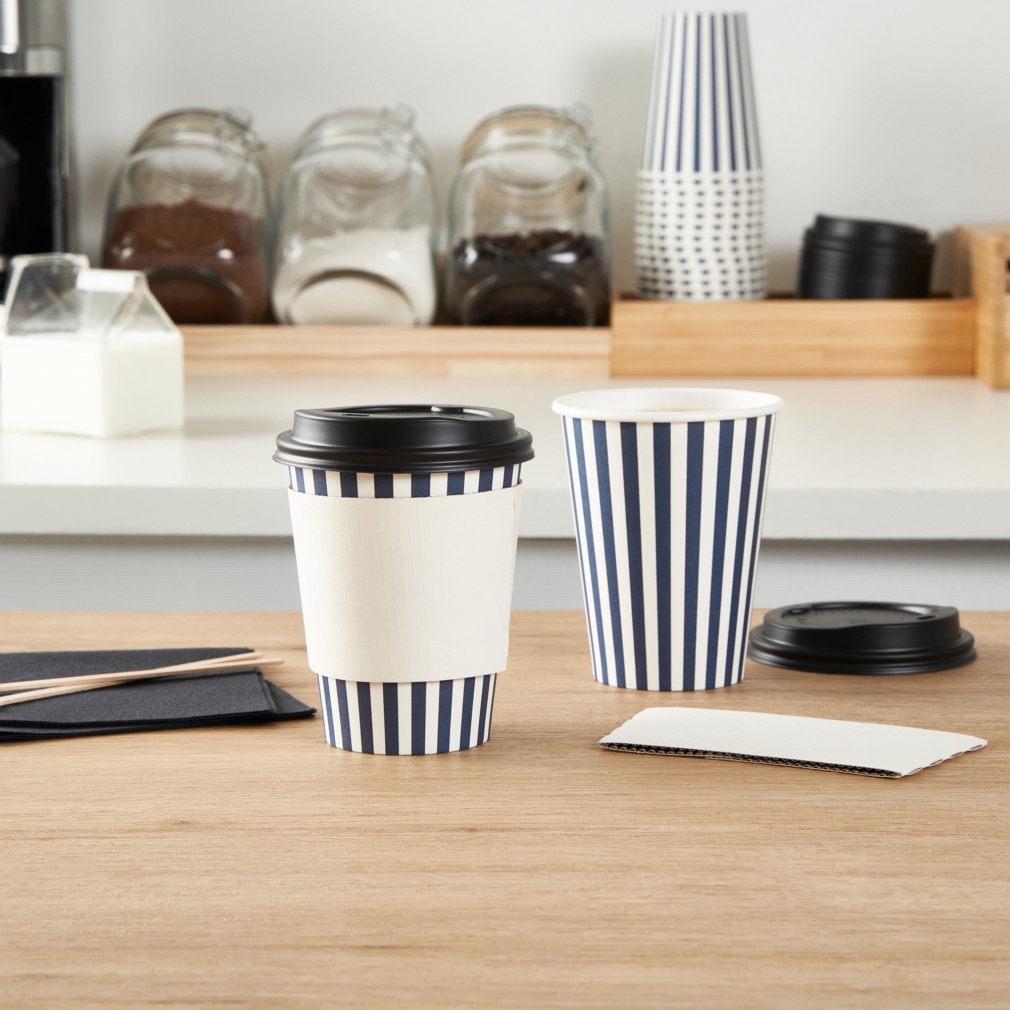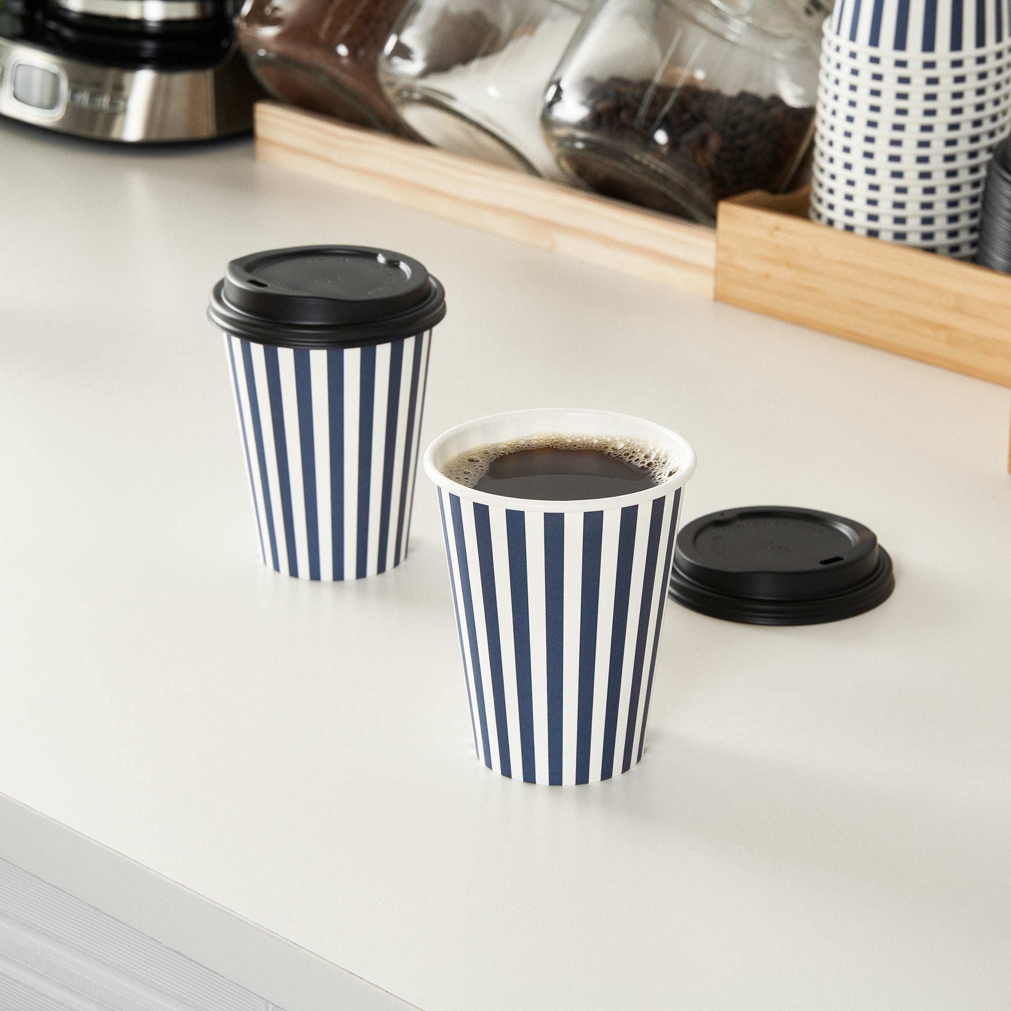 Savor your favorite brews with our Restpresso 12-ounce Blue and White Stripe Paper Single Wall Coffee Cups. Designed for hot and cold beverages, these single-use coffee cups are versatile additions to your cafe, bakery, or food truck. The greaseproof PE liner inside these paper coffee cups ensures your drinks remain leak-free and delicious. Perfectly designed for coffee lovers on the go, these disposable hot cups come with a secure black lid to reduce spills and leaks. Flaunting a charming blue and white striped finish, these coffee cups will leave a lasting impression on your customers. Crafted with a single wall, these coffee cups are suitable for all kinds of drinks. With a rolled rim and leak-resistant seam, these stackable coffee cups ensure a premium drinking experience for your customers. Blend these vibrant coffee cups with our diverse sleeve options, ensuring a colorful and heat-resistant coffee routine. Boasting a generous capacity of 12 ounces, these recyclable hot tea cups are ideal for serving medium-sized beverages. Measuring 3.5 inches in diameter and 4.5 inches in height, these disposable hot cups are compact yet spacious enough to accommodate your delicious lattes, cappuccinos, or teas. Sold in a 400 count box. Sleeves are available and sold separately.