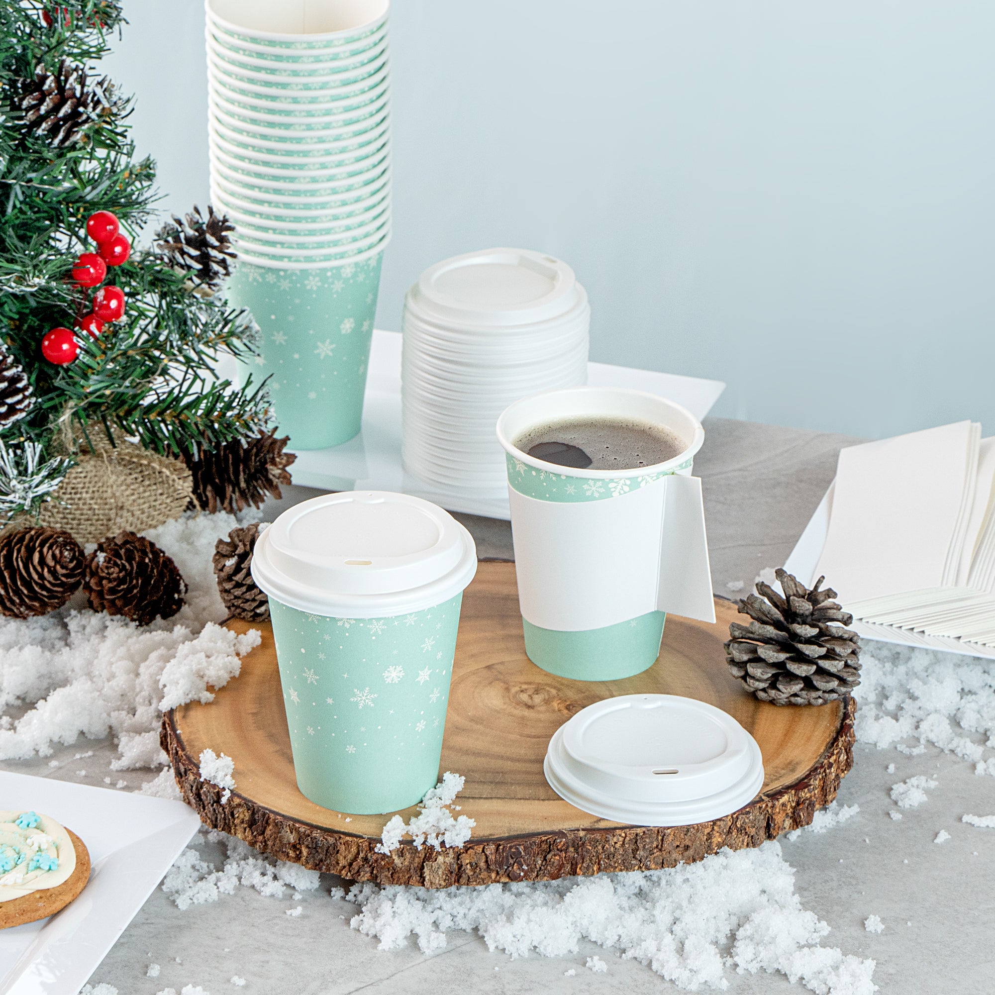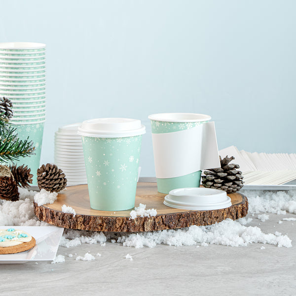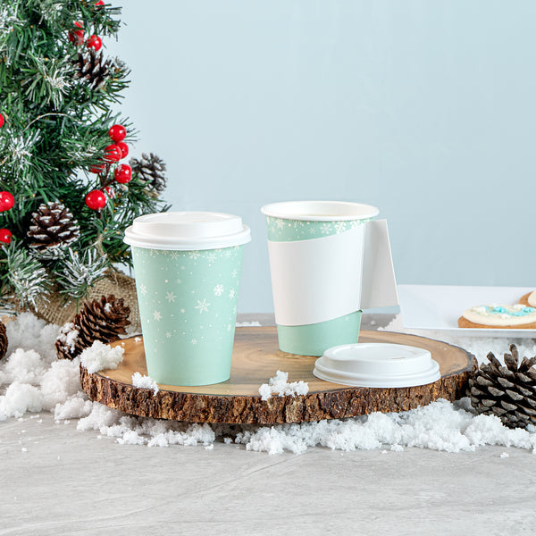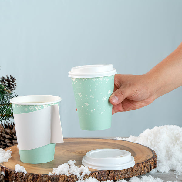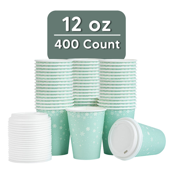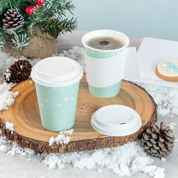 Embrace the festive season with our Restpresso 12-ounce Blue Christmas Snowflakes Paper Single Wall Coffee Cups. These coffee cups come equipped with white plastic lids that form a secure seal, ensuring an optimal on-the-go sipping experience. Featuring an enchanting snowflake design on a blue finish, these paper coffee cups evoke the cozy charm and festive spirit of the season. The greaseproof PE lining inside these hot drink cups ensures a mess-free drinking experience for your patrons. With a rolled rim, these disposable cups for coffee provides a smooth beverage flow with every sip. These 12-ounce coffee cups are crafted from durable paper and suitable for serving hot and cold drinks. The leak-resistant seams of these disposable coffee cups minimize the risk of potential leaks, making them reliable and efficient. Adorned with a “recycle me” message on the bottom, these hot cups with lids encourage guests to dispose of them in a planet-friendly way. These disposable paper cups can be discarded after use for an efficient cleaning experience. Measuring 3.5 inches in diameter by 4.68 inches in height, these coffee cups with lids have a capacity of 12 ounces. Sold in a 400 count box.