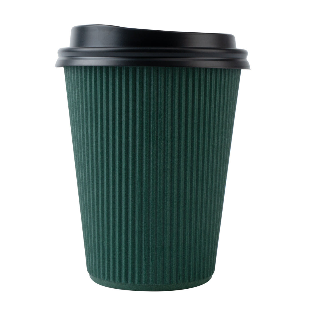 12 OZ DARK GREEN PAPER RIPPLE WALL COFFEE CUP - WITH BLACK LID