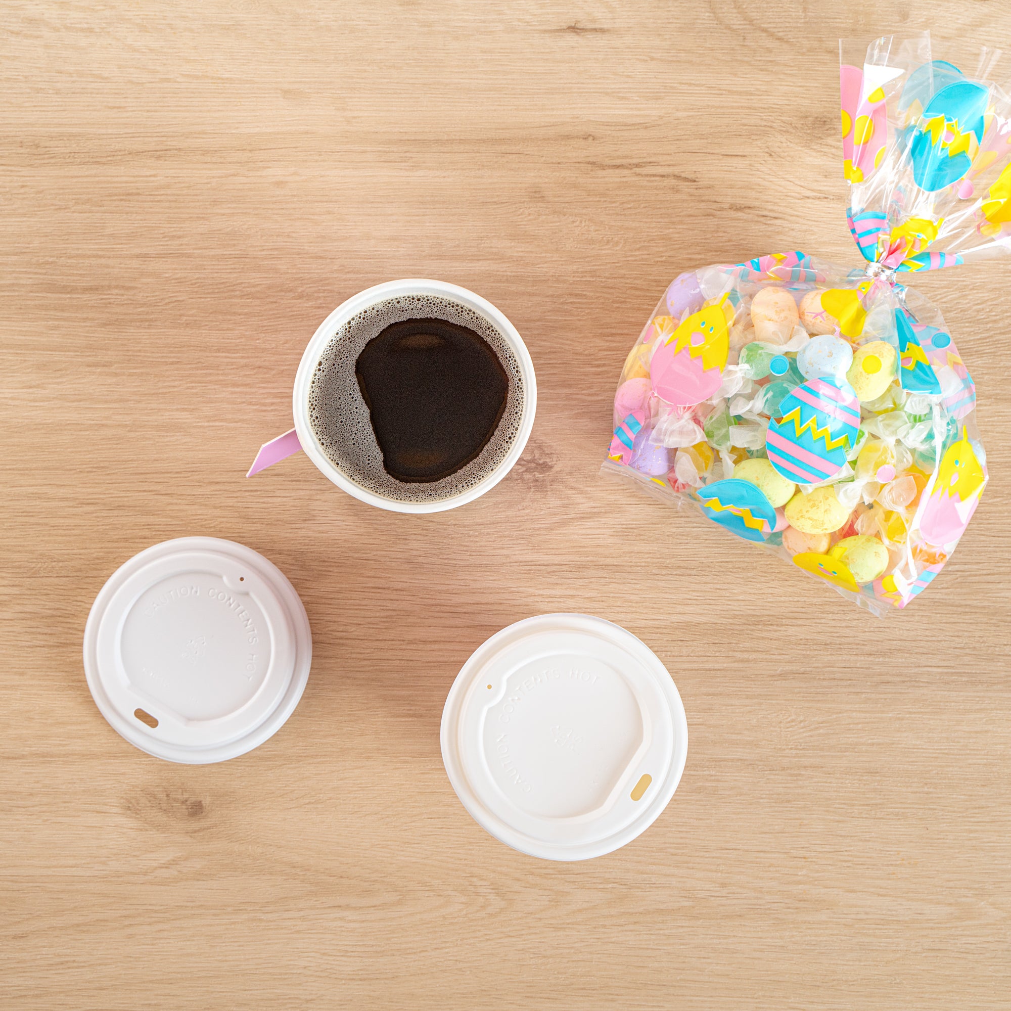 Celebrate the joy of the season with our Restpresso 12-ounce Easter Paper Single Wall Coffee Cups. These disposable coffee cups come equipped with white plastic lids that form a secure seal, perfect for an on-the-go sipping experience. Featuring playful bunny ears and vibrant Easter eggs, these hot drink cups infuse every sip with the joy and renewal of the season's festivities. The greaseproof PE lining of these paper coffee cups ensures a mess-free drinking experience, making them an excellent choice for busy mornings. With a rolled rim design, these hot cups with lids provide a smooth beverage flow and enhance your drinking experience. These 12-ounce coffee cups are made from premium paper and are suitable for serving hot and cold beverages. The leak-resistant seams of these coffee cups minimize the risk of potential leaks, making them reliable for any occasion. Encouraging eco-friendly disposal, these disposable cups for coffee are adorned with a “recycle me” message on the bottom. These paper tea cups are disposable and can be discarded after use for an easy cleaning experience. With a capacity of 12 ounces, these coffee cups with lids measure 3.5 inches in diameter by 4.68 inches in height. Sold in a 400 count box.