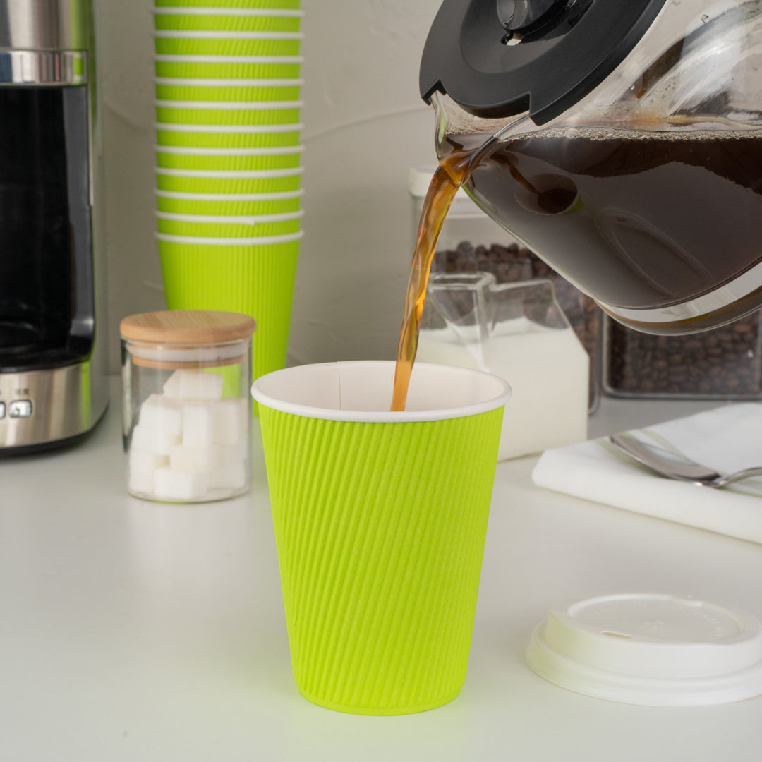 Deliver drinks in style with insulated, eco-friendly cups. Restpresso 12 oz Eco Green Paper Ripple Wall Coffee Cups with White Lids offer superior heat insulation through their ripple wall design, ensuring beverages remain hot while the cup stays comfortable to hold. These 12 oz paper cups are crafted from sustainable materials, aligning with environmentally conscious business practices and supporting sustainability initiatives in cafes. With a 90-millimeter diameter, these ripple wall coffee cups fit standard cup holders, providing convenience for customers on the go. The vibrant green coffee cups add a touch of visual appeal and style to your coffee service, making them stand out in any setting. Made from paper, they are recyclable, further enhancing your establishment's eco-friendly credentials. Measuring 3.6 inches in diameter and 5.1 inches in height, they are conveniently sized for easy handling and storage. Sold in a 20 count box.
