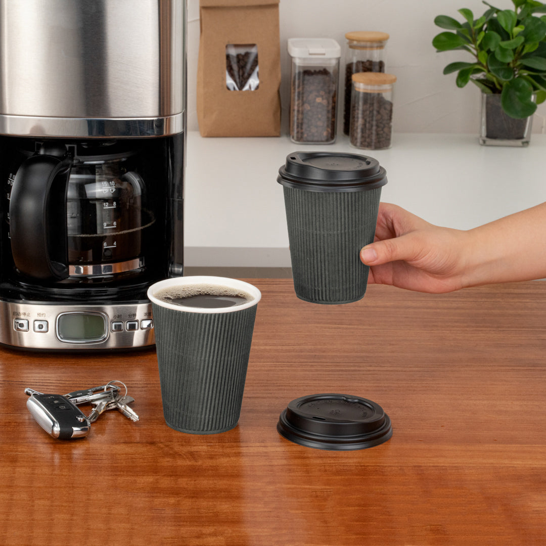 12 OZ GRAY PAPER RIPPLE WALL COFFEE CUP - WITH BLACK LID