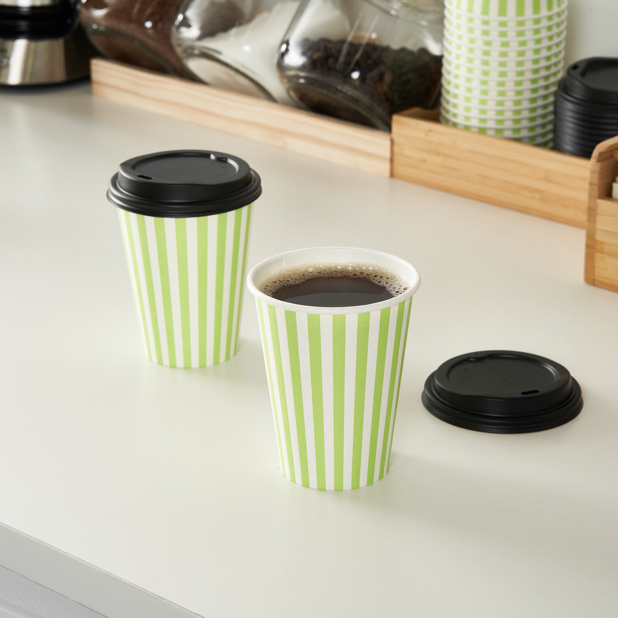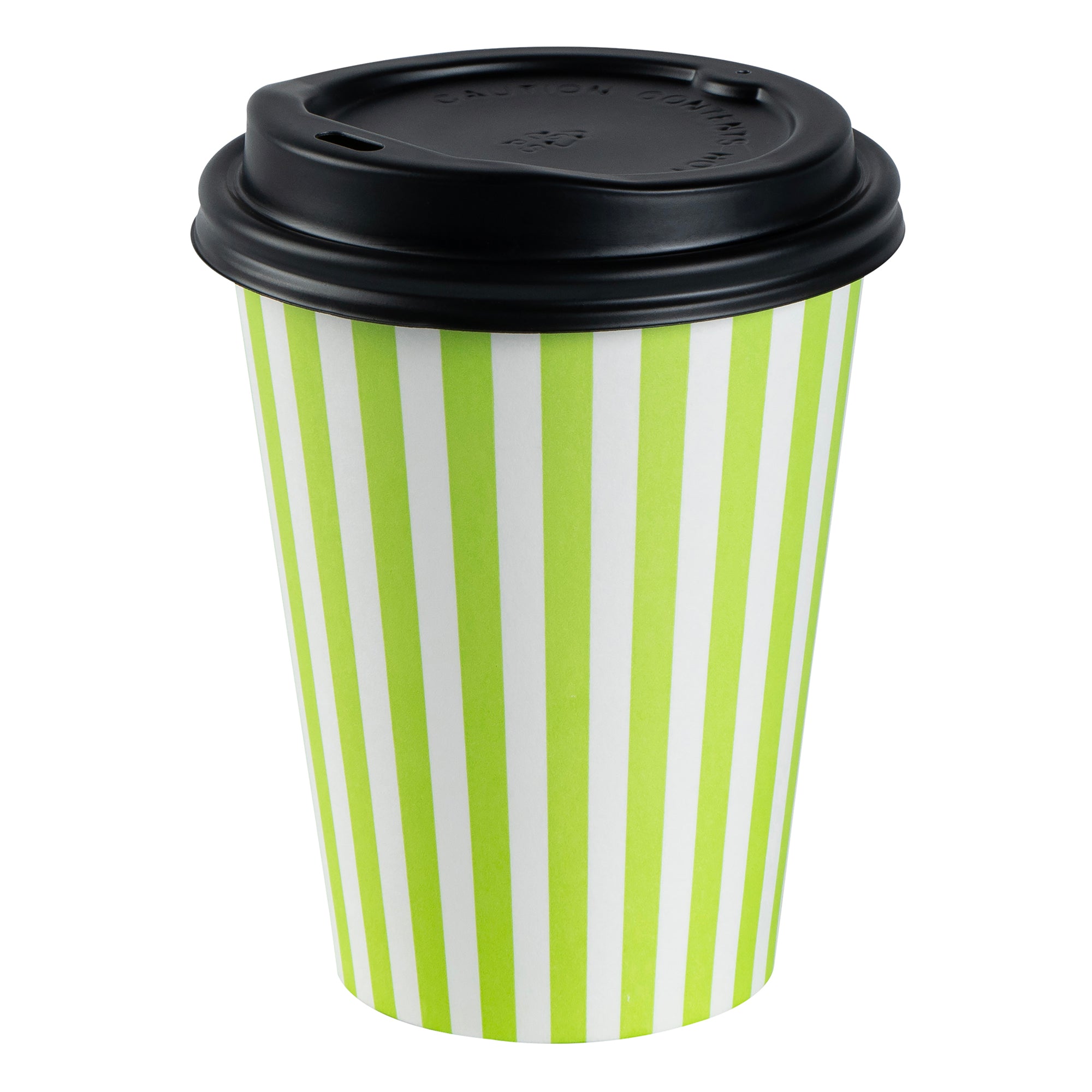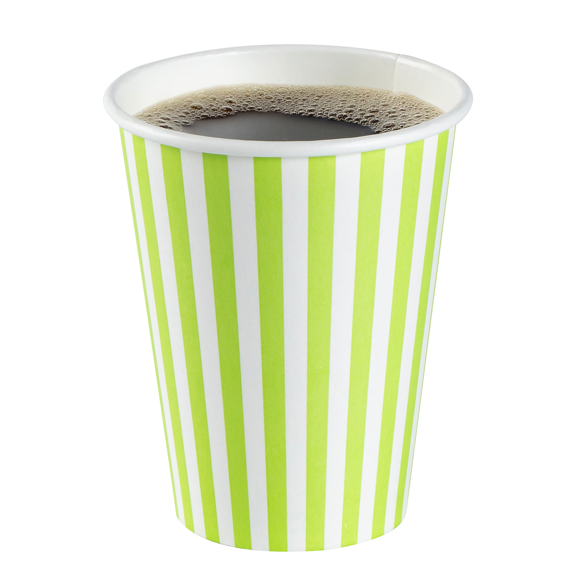Start your day with our Restpresso 12-ounce Green and White Stripe Paper Single Wall Coffee Cups. These paper coffee cups are designed with a greaseproof PE liner, ensuring your beverage stays hot while your hands stay comfortable. The leakproof black lid of these cups for coffee are perfect for your on-the-go beverages. Add a touch of style to your morning routine with these disposable paper coffee cups' distinctive green and white striped finish, a standout in the world of disposable hot cups. Single wall construction offers a lightweight yet sturdy solution for on-the-go coffee drinkers. These coffee cups are suitable for hot and cold drinks, making them a versatile addition to any cafe or restaurant. With their rolled rim and leak-resistant seam, these single-use coffee cups provide a secure, comfortable drinking experience. These stackable coffee cups save valuable counter space in your busy establishment. Combine these coffee cups with our variety of cup sleeves engineered for better grip, decreasing the likelihood of accidental spills or slips. With a capacity of 12 ounces, these single wall coffee cups are just the right size for a satisfying cup of joe. Measuring 3.5 inches in diameter by 4.5 inches in height, these recyclable hot tea cups have a compact design that fits comfortably in most car cup holders and coffee machines. Sold in a 400 count box. Sleeves are available and sold separately.