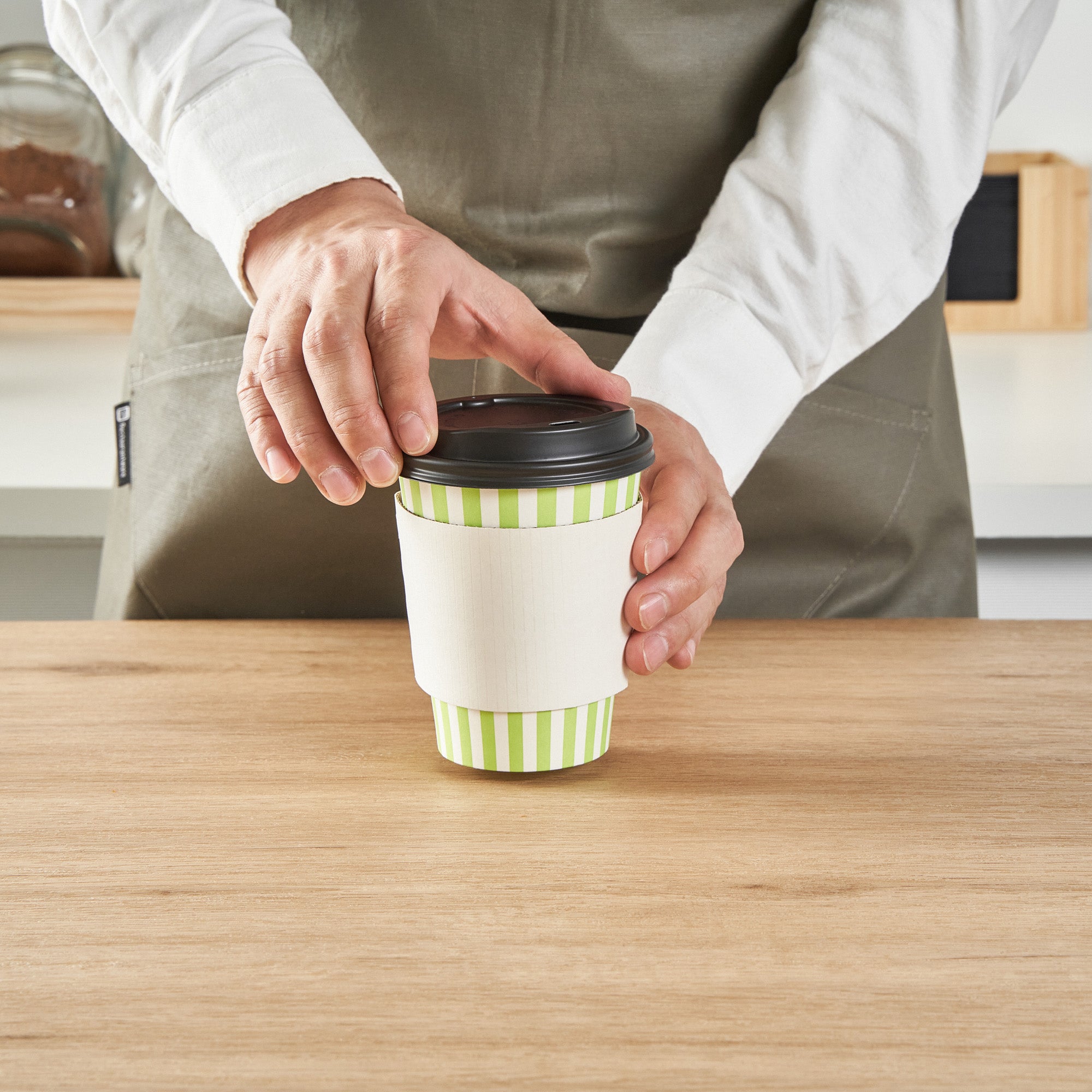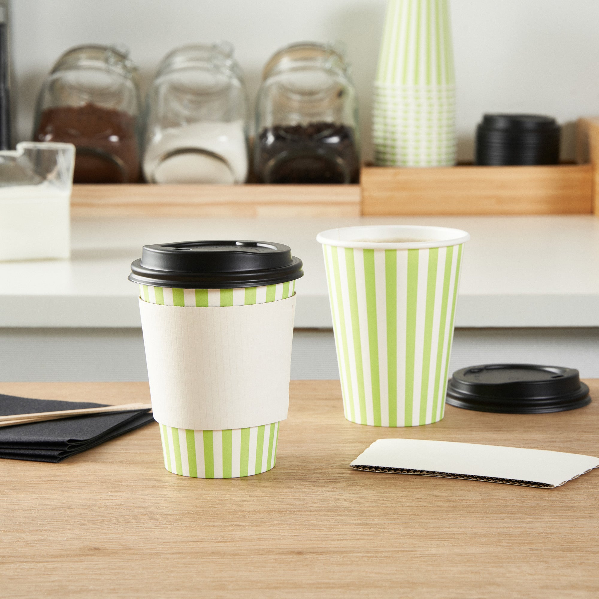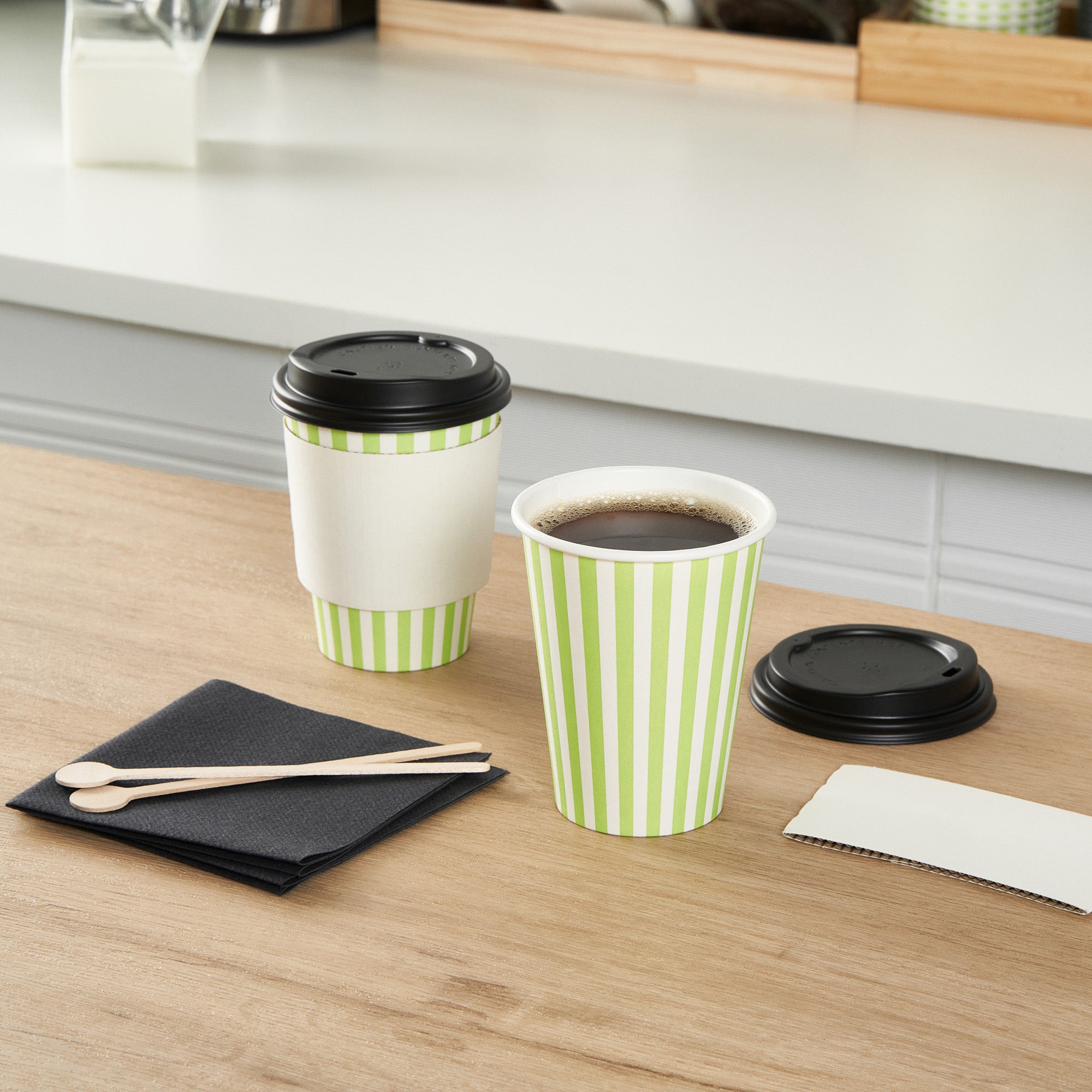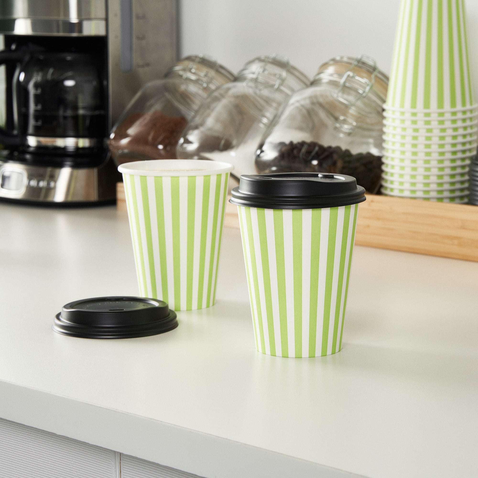 Start your day with our Restpresso 12-ounce Green and White Stripe Paper Single Wall Coffee Cups. These paper coffee cups are designed with a greaseproof PE liner, ensuring your beverage stays hot while your hands stay comfortable. The leakproof black lid of these cups for coffee are perfect for your on-the-go beverages. Add a touch of style to your morning routine with these disposable paper coffee cups' distinctive green and white striped finish, a standout in the world of disposable hot cups. Single wall construction offers a lightweight yet sturdy solution for on-the-go coffee drinkers. These coffee cups are suitable for hot and cold drinks, making them a versatile addition to any cafe or restaurant. With their rolled rim and leak-resistant seam, these single-use coffee cups provide a secure, comfortable drinking experience. These stackable coffee cups save valuable counter space in your busy establishment. Combine these coffee cups with our variety of cup sleeves engineered for better grip, decreasing the likelihood of accidental spills or slips. With a capacity of 12 ounces, these single wall coffee cups are just the right size for a satisfying cup of joe. Measuring 3.5 inches in diameter by 4.5 inches in height, these recyclable hot tea cups have a compact design that fits comfortably in most car cup holders and coffee machines. Sold in a 400 count box. Sleeves are available and sold separately.
