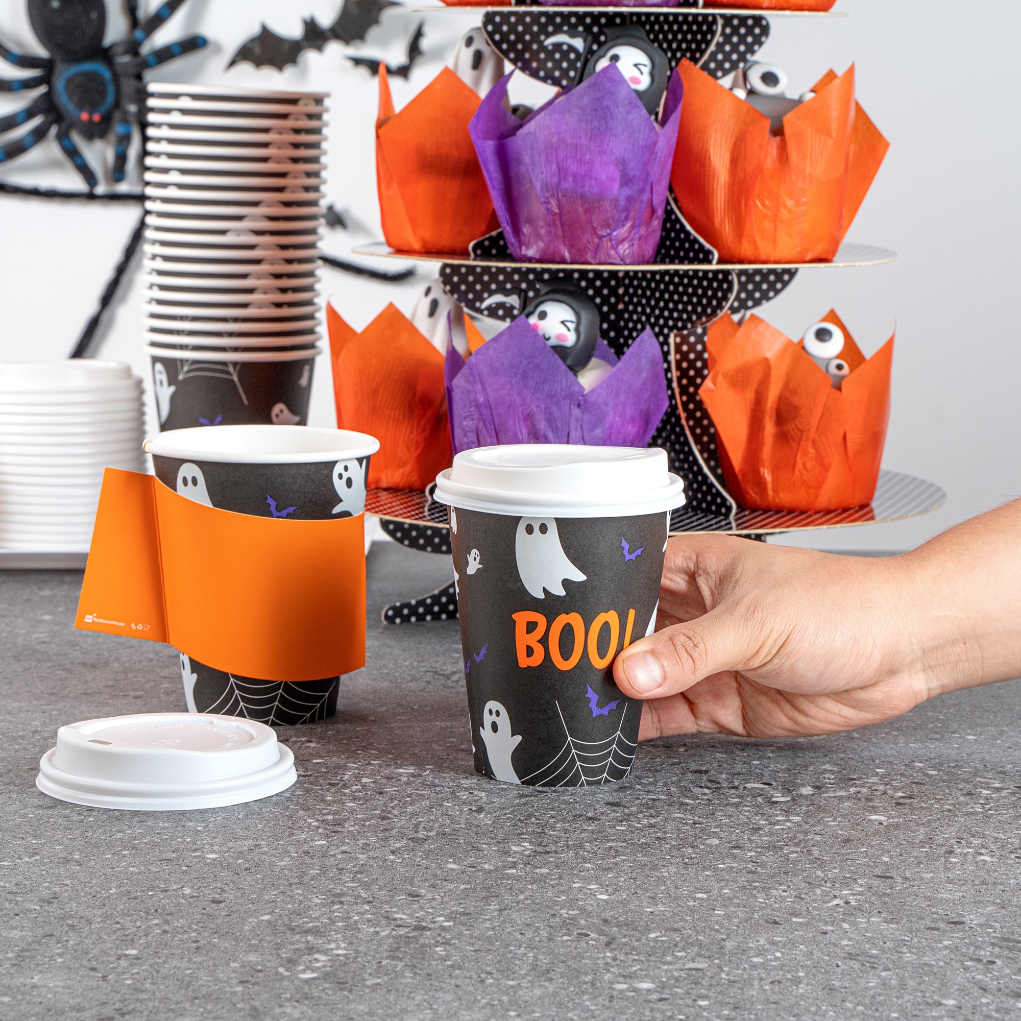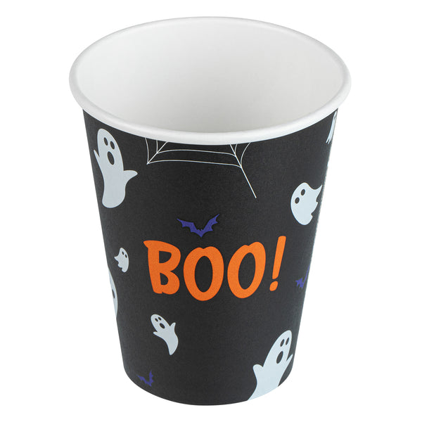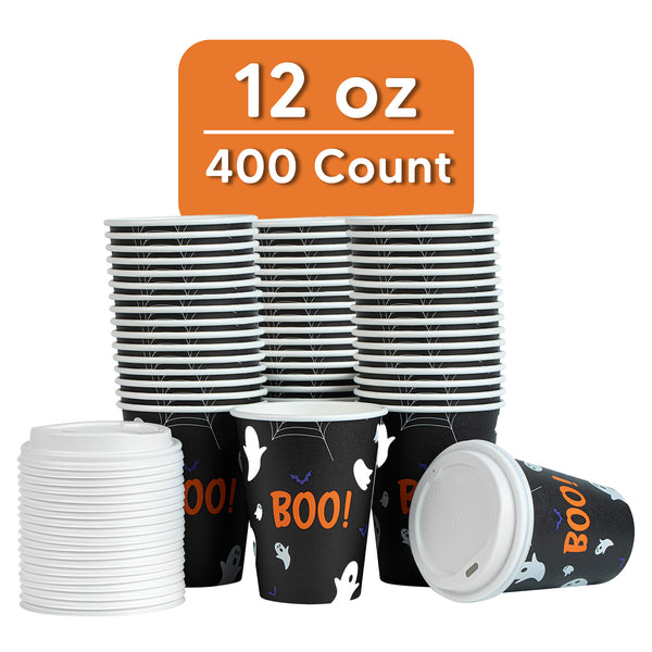 Embrace the spooky season with our Restpresso 12-ounce Halloween Paper Single Wall Coffee Cups. These disposable coffee cups come equipped with white plastic lids that form a secure seal and prevent spills, ideal for an on-the-go sipping experience. Featuring whimsical floating ghosts and the word "Boo," these hot cups with lids add a touch of spooky charm to your favorite drinks as you revel in the magic of the season's festivities. The greaseproof PE lining of these paper coffee cups ensures a mess-free drinking experience for your guests. Designed with a rolled rim, these hot drink cups provide a smooth flow of beverages with every sip. Crafted from premium paper, these 12-ounce coffee cups are durable and ideal for serving hot and cold beverages. The leak-resistant seams of these coffee cups with lids minimize the risk of potential leaks, making them ideal for busy mornings. Adorned with a “recycle me” message on the bottom, these disposable cups for coffee encourage guests to dispose of them in a planet-friendly way. These coffee cups are disposable and can be discarded quickly after use. Measuring 3.5 inches in diameter by 4.68 inches in height, these disposable paper cups have a capacity of 12 ounces. Sold in a 400 count box.