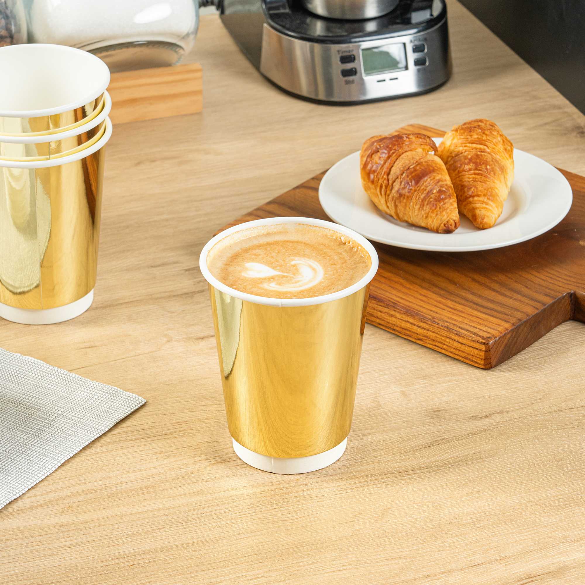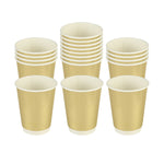 Serve drinks with flair using our Restpresso 12-ounce Metallic Gold Paper Hot / Cold Cups. Their radiant gold exterior brings an elegant accent to everything from corporate galas to festive brunches. Versatile enough for hot espresso or iced lemonade, these cups support a range of beverage needs. Crafted from high-quality paper, they resist leaks and softening during use. Their freezer-safe design makes them an excellent choice for preparing cold offerings in advance. A refined yet practical option for stylish hosts and busy caterers alike. Each cup measures 2.36 inches in diameter by 4.33 inches in height and holds up to 12 ounces. Sold in a 500 count box.