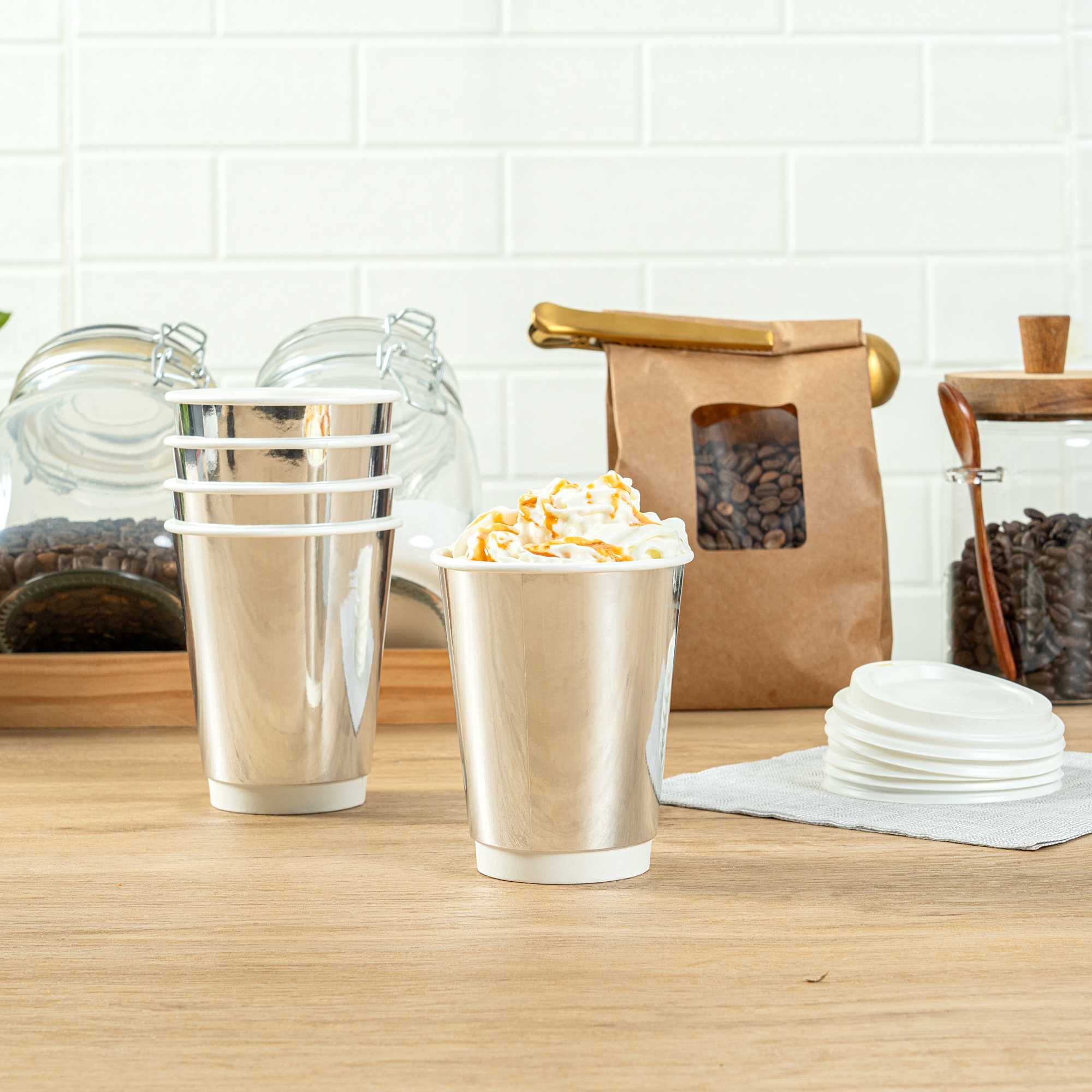 Add a modern edge to your drink presentation with our Restpresso 12-ounce Metallic Silver Paper Hot / Cold Cups. The eye-catching silver finish offers a refined aesthetic suitable for upscale events and everyday use alike. Built to handle hot and cold beverages, these cups are great for lattes, teas, soft drinks, and more. Their sturdy paper construction provides reliable strength throughout service. With freezer-safe functionality, they're also suited for prepping chilled beverages or desserts ahead of time. Ideal for both formal and casual gatherings, these cups deliver polished style with disposable ease. Each cup measures 2.36 inches in diameter by 4.33 inches in height and holds up to 12 ounces. Sold in a 500 count box.