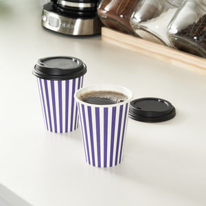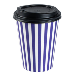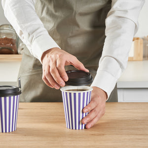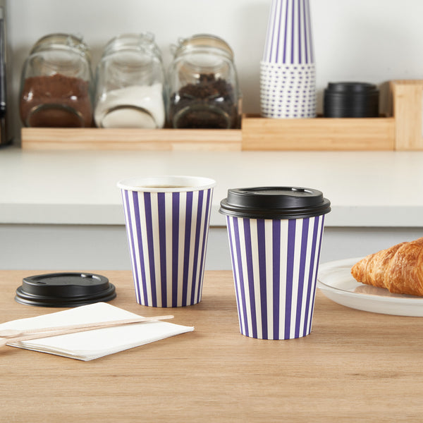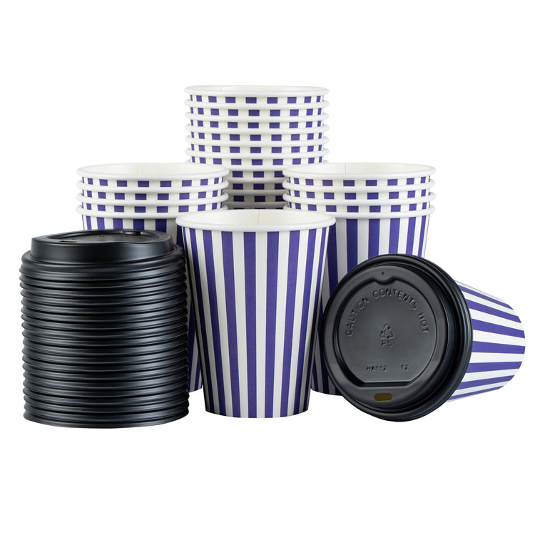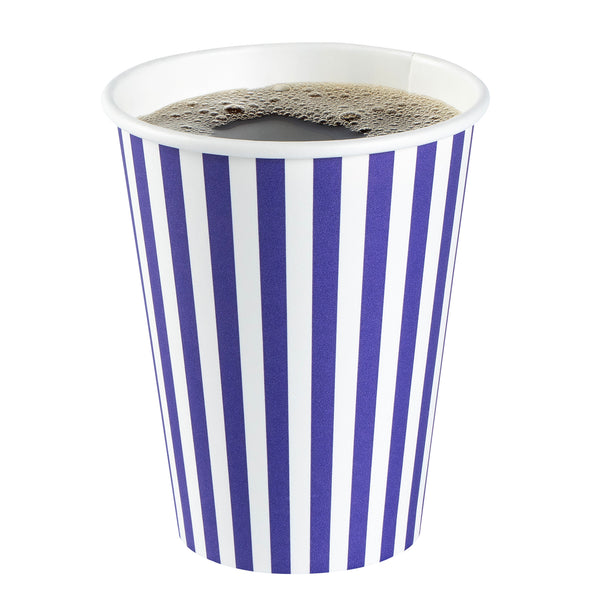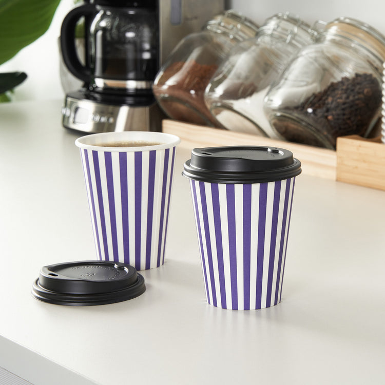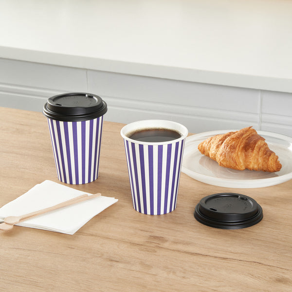 Elevate your customers' coffee experience with our Restpresso 12-ounce Purple and White Stripe Paper Single Wall Coffee Cups. Designed with a purple and white stripe finish, these paper coffee cups instantly add a pop of color to any beverage service. The single-wall construction of these disposable hot cups ensures durability while holding all kinds of drinks. Plus, the greaseproof PE liner is integrated into these single wall coffee cups, averting leaks and creating a reliable seal for secure handling. Boasting a rolled rim, these beverage cups provide a comfortable drinking experience and fit perfectly with the included black lids. These coffee cups are also stackable, maximizing storage space in your cafe, food truck, or other foodservice establishment.Pair these coffee cups with our selection of cup sleeves that offer an improved grip, thereby reducing the chances of accidental spills or slips. With a generous capacity of 12 ounces, these recyclable hot tea cups can hold ample amounts of coffee, tea, or other hot beverages. Measuring 3.5 inches in diameter by 4.5 inches in height, these striped coffee cups are compact and easy to hold, making them ideal for customers on the go. Sold in a 20 count box. Sleeves are available and sold separately.