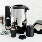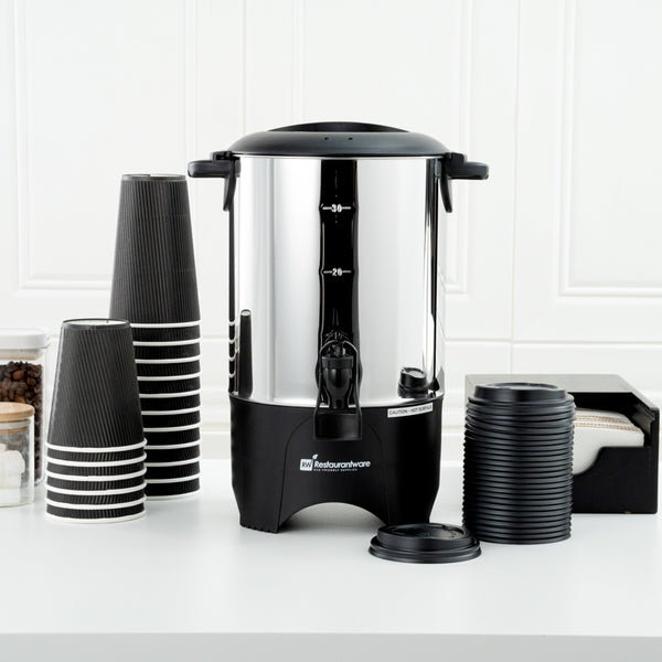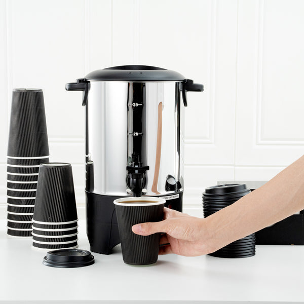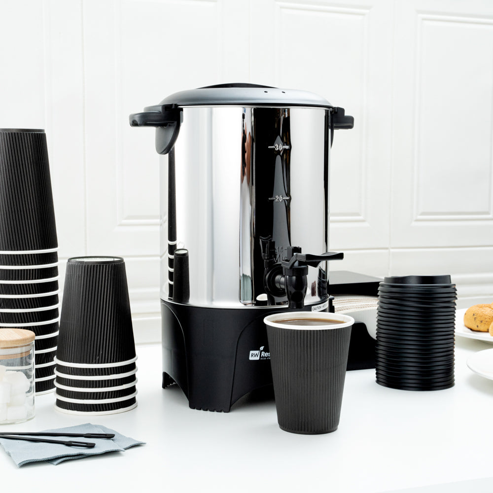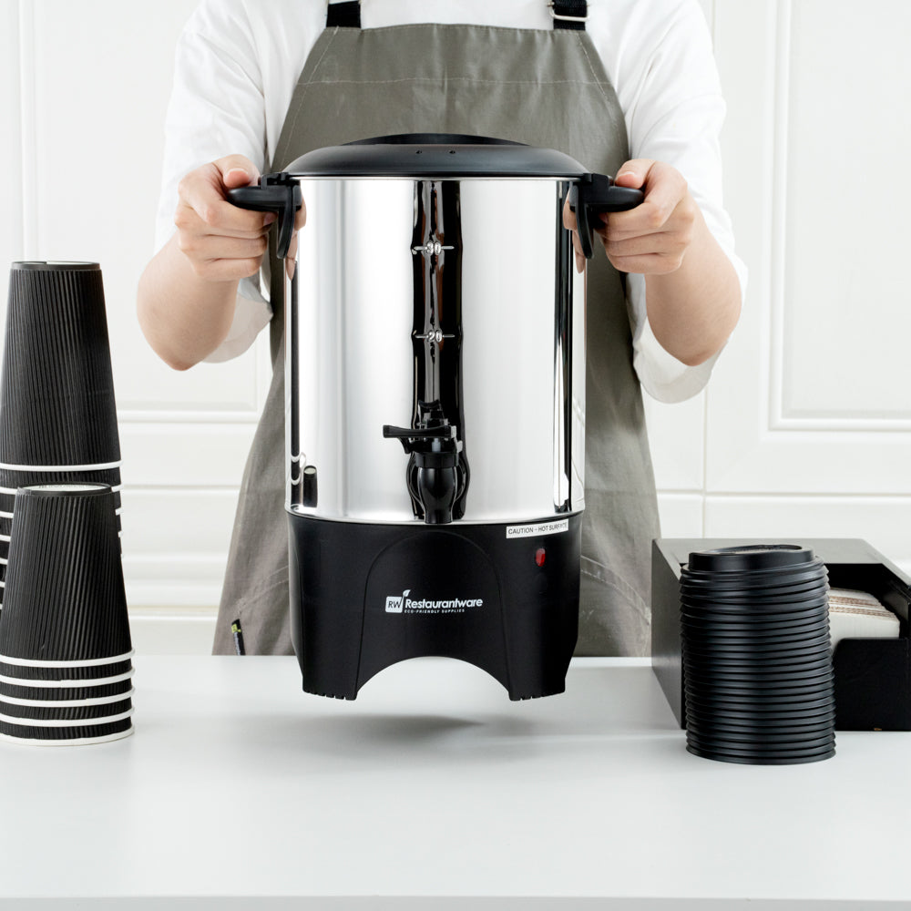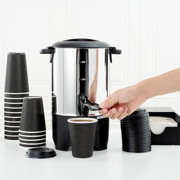 Perfect for serving large crowds or small groups at events, these coffee urns are available in various sizes to serve 30, 46, 67, or 128 cups of 5-ounce beverages. Have enough to serve everyone!